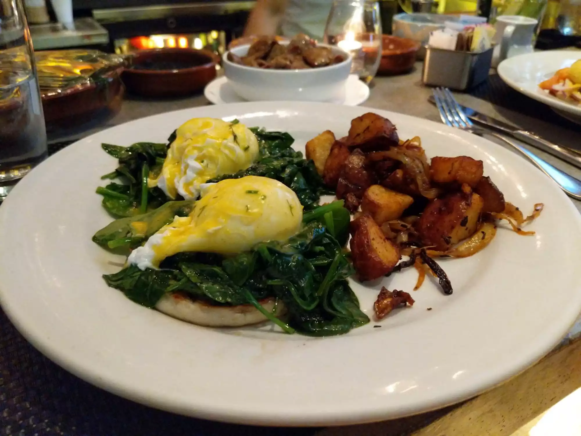 With a Mediterranean flair, this local upper west side spot takes classic brunch and creates new flavors and combos that break up the monotony of a Sunday brunch. They have breakfast and lunch items, and some that fit in between. The skirt steak with spinach and a paochedbegg was outstanding. If you whole 30 lots of great options. Friendly staff and great service.