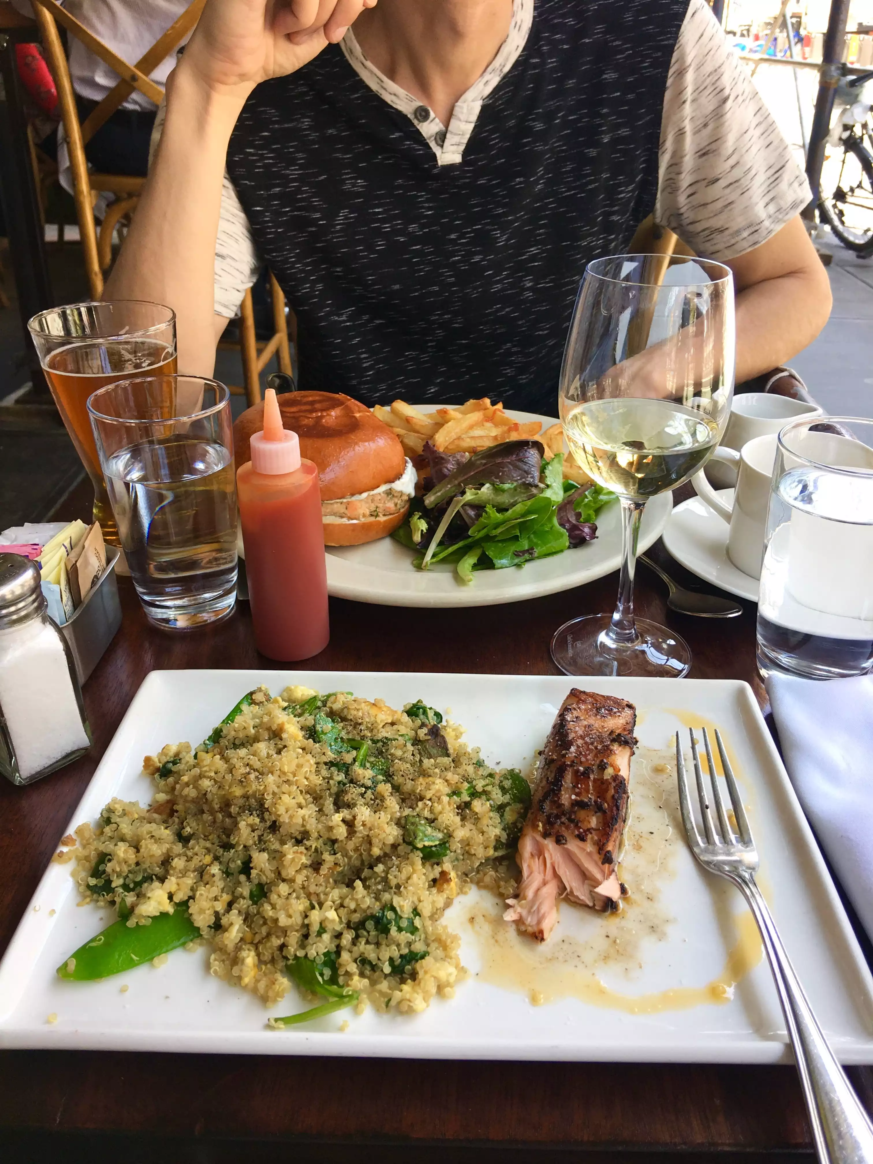 Eating in UES can be a tricky situation. Most restaurants sadly are mediocre and family oriented. So we were elated to stumble upon this stand up joint. On a hot sunny day you can sit comfortably outside under the big awning. I was able to find both good wine and healthy choices on the menu. Nothing makes me happier. Veggie burger, quinoa salad and grilled salmon all very tasty. It's a thumbs up from us.