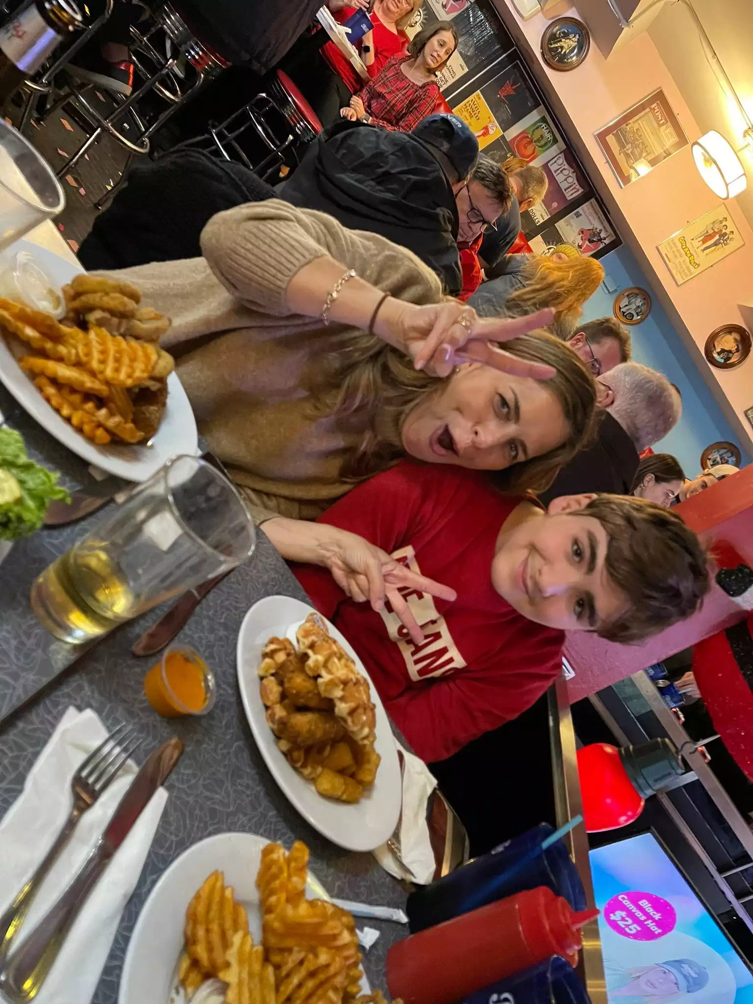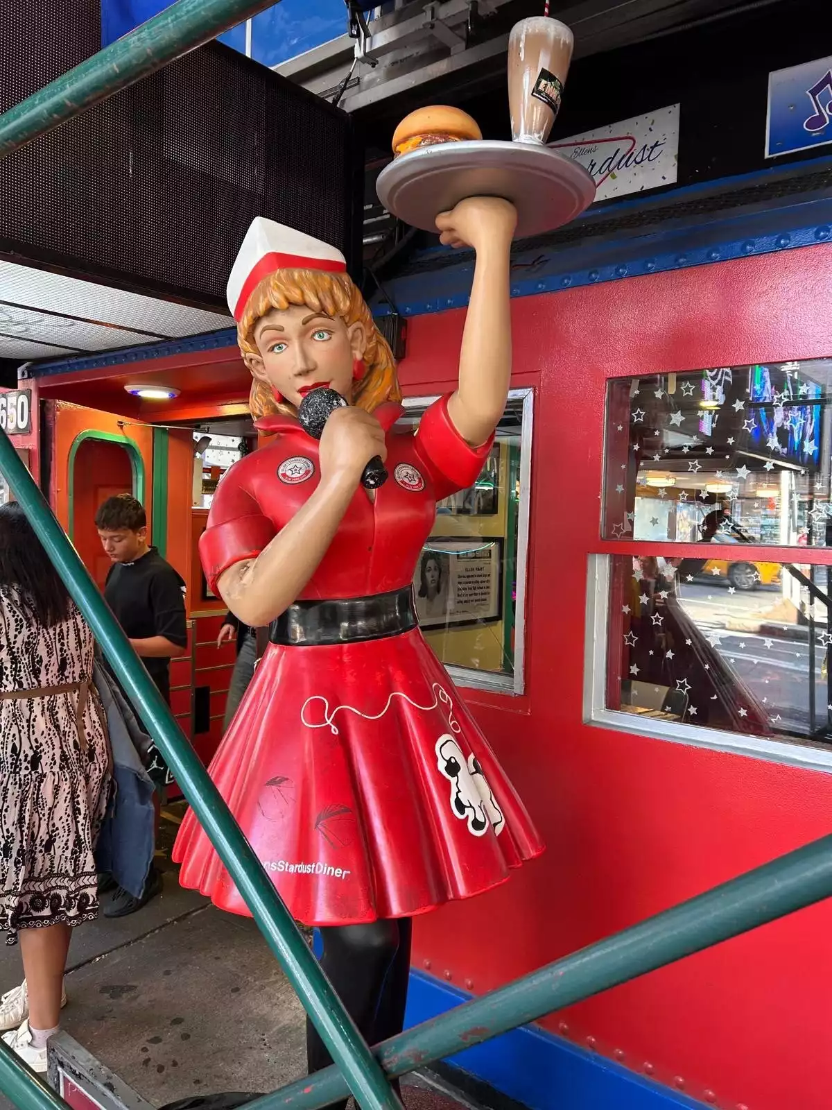 Ellen's Stardust Diner is a must-see experience on a trip to New York! We stayed here in May with the family and were amazed. It's a place out of the ordinary compared to the places that are around us. The food is classic American style, but the real magic is the Service with "show": the waiters sing live with incredible professionalism and skill. It feels like Broadway, but while you're eating dinner! The atmosphere is vibrant, fun and exciting. It is absolutely worth it to queue up and wait your turn to enjoy such a unique evening. If you're in New York, a visit here is a must. Go there and have fun!