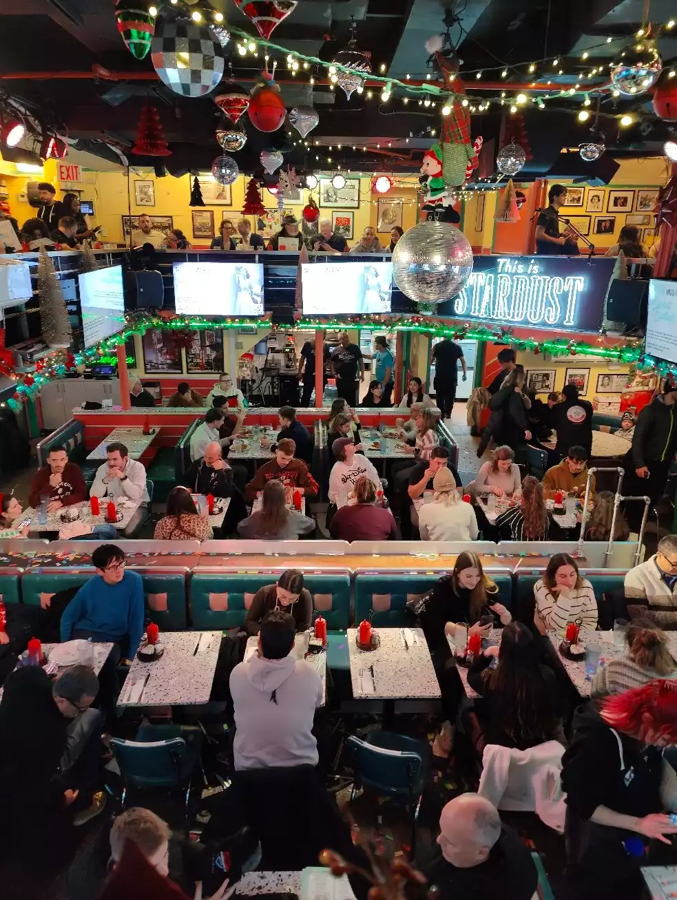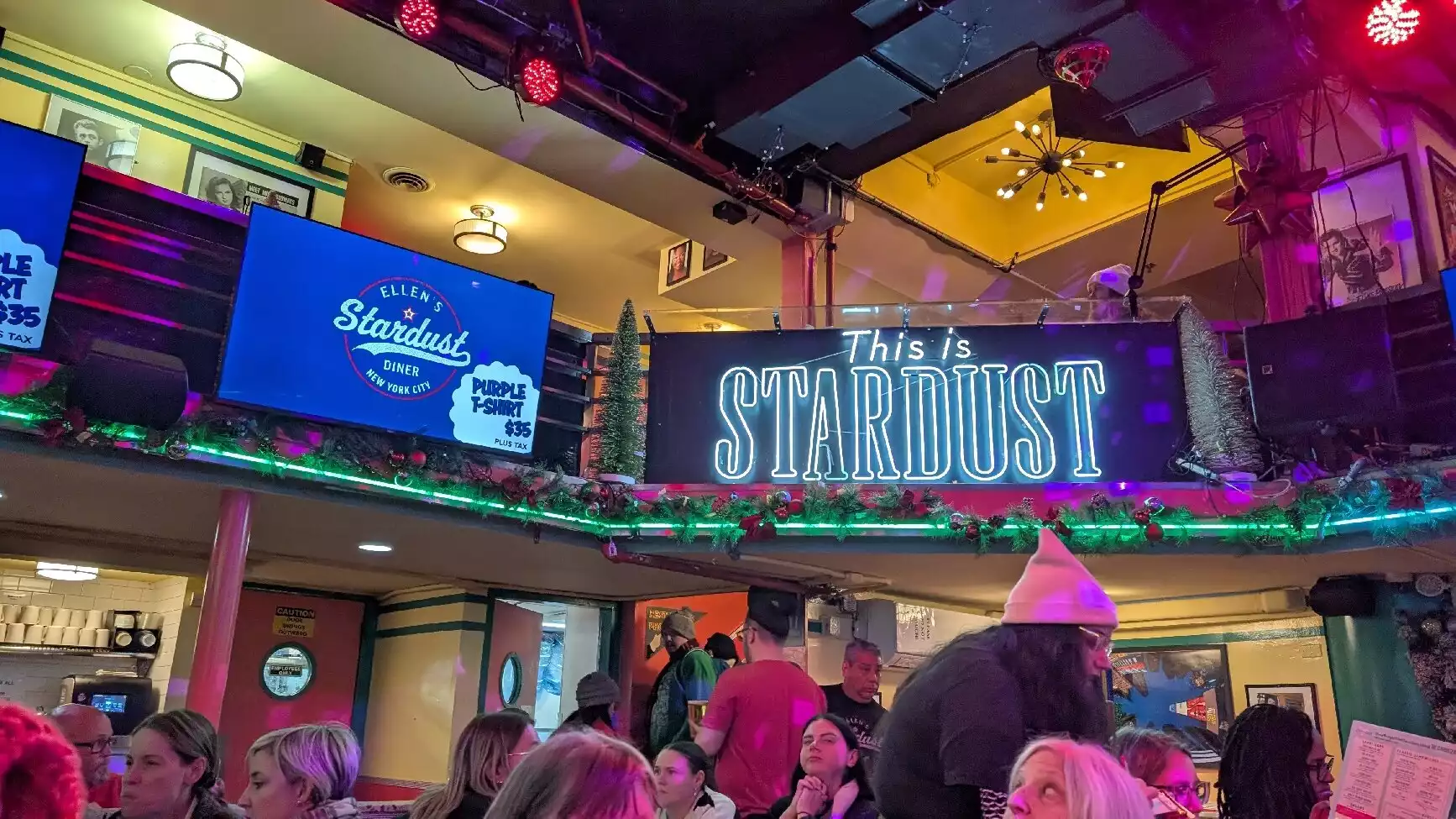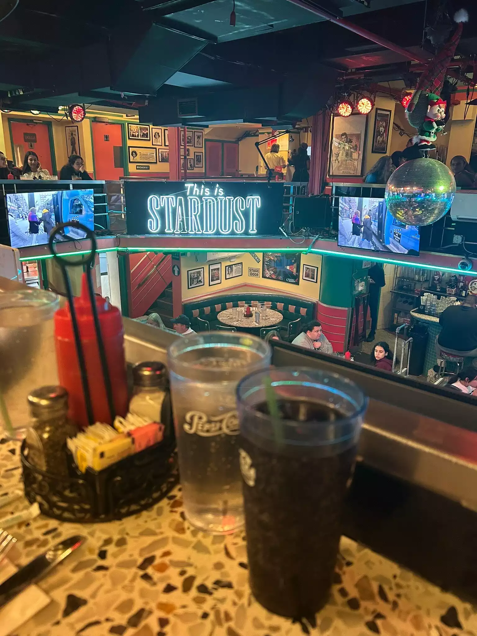 Stayed overnight in the city to watch the Christmas Spectacular at Radio City Music Hall. Our hotel was about a 6 minute walk, so perfect location for us. Went for late lunch (2) to the Stardust. We waited for about 45 minutes outside but thankfully you are covered and blocked from the winter elements. Got a great booth upstairs, had a tentative waitress, and the food was "ok" for the price (the kids loved it so I guess chicken tenders and pancakes were great lol). We didn't want to leave as we enjoyed the singing and entertainment very much. Will definitely go again when we return to the city.