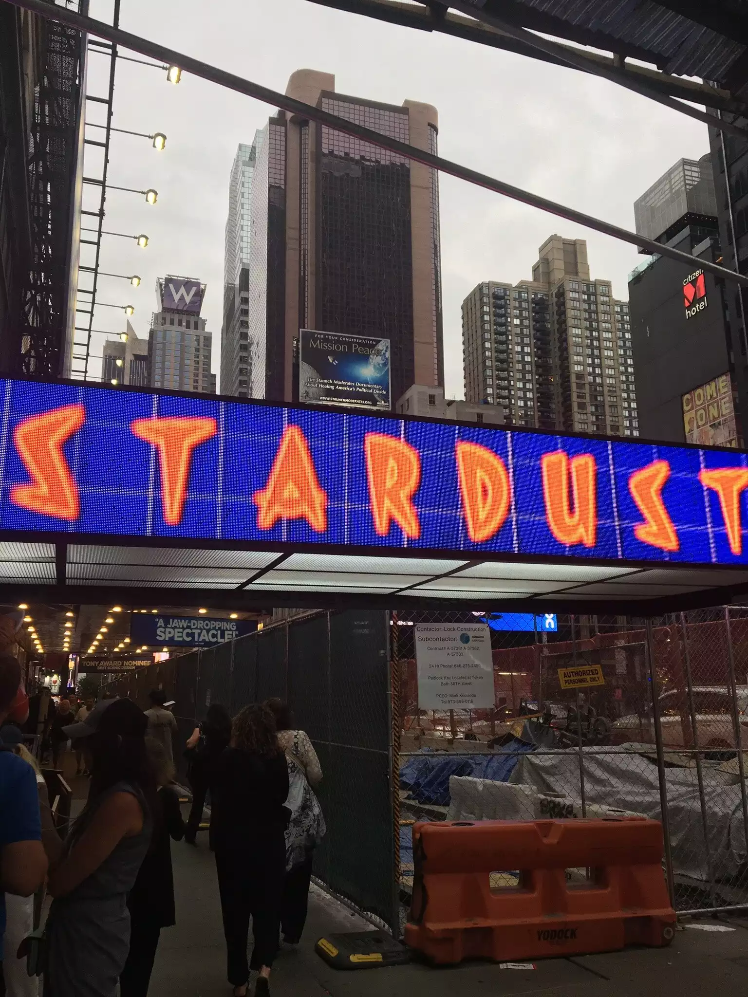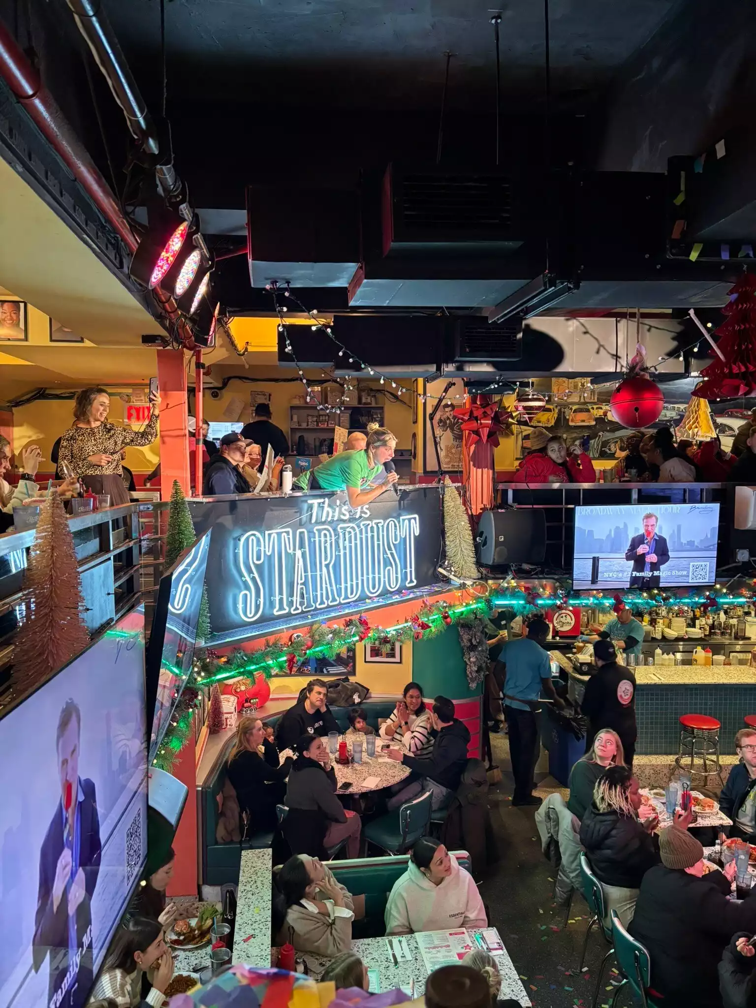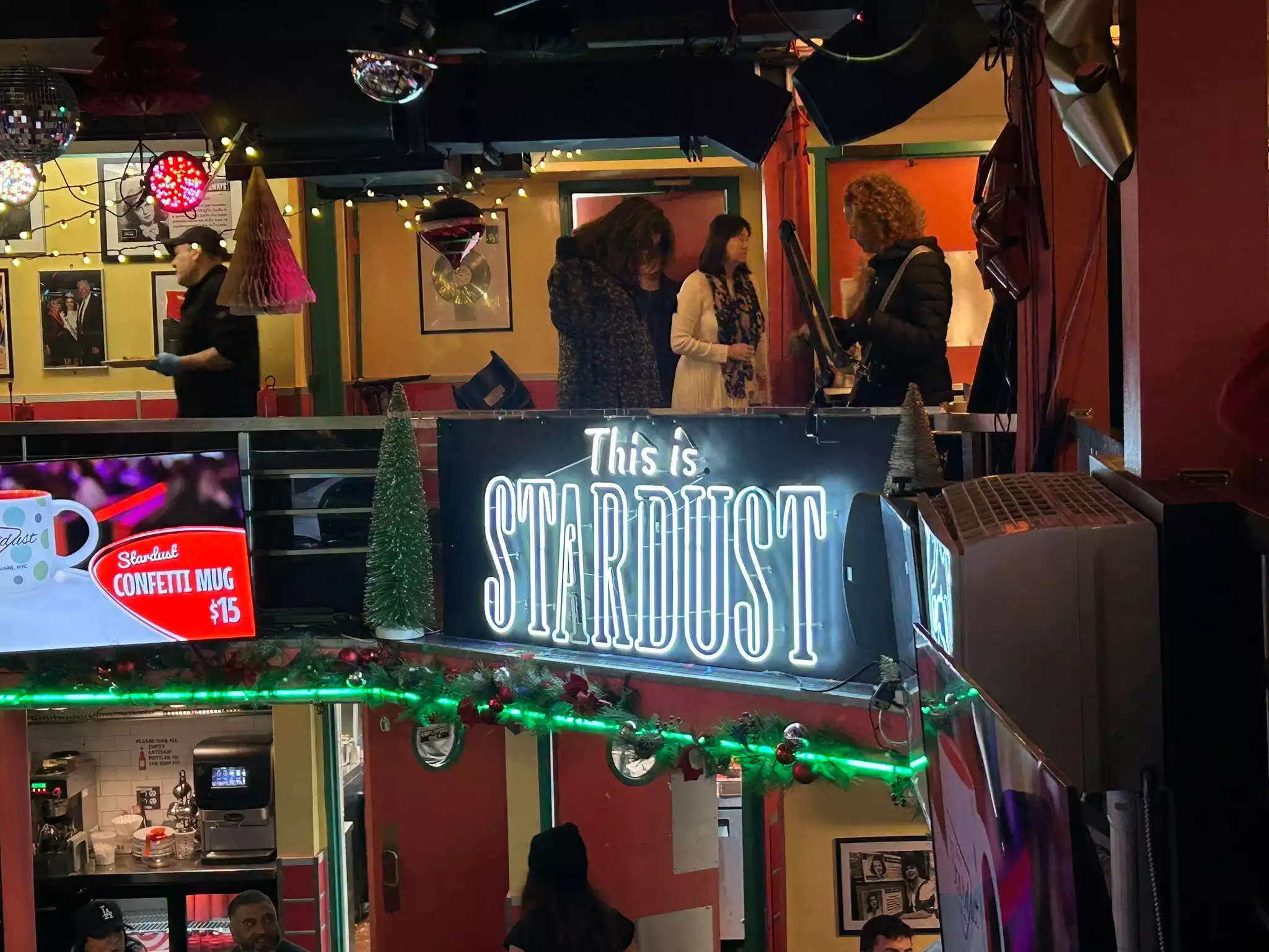 Stayed overnight in the city to watch the Christmas Spectacular at Radio City Music Hall. Our hotel was about a 6 minute walk, so perfect location for us. Went for late lunch (2) to the Stardust. We waited for about 45 minutes outside but thankfully you are covered and blocked from the winter elements. Got a great booth upstairs, had a tentative waitress, and the food was "ok" for the price (the kids loved it so I guess chicken tenders and pancakes were great lol). We didn't want to leave as we enjoyed the singing and entertainment very much. Will definitely go again when we return to the city.