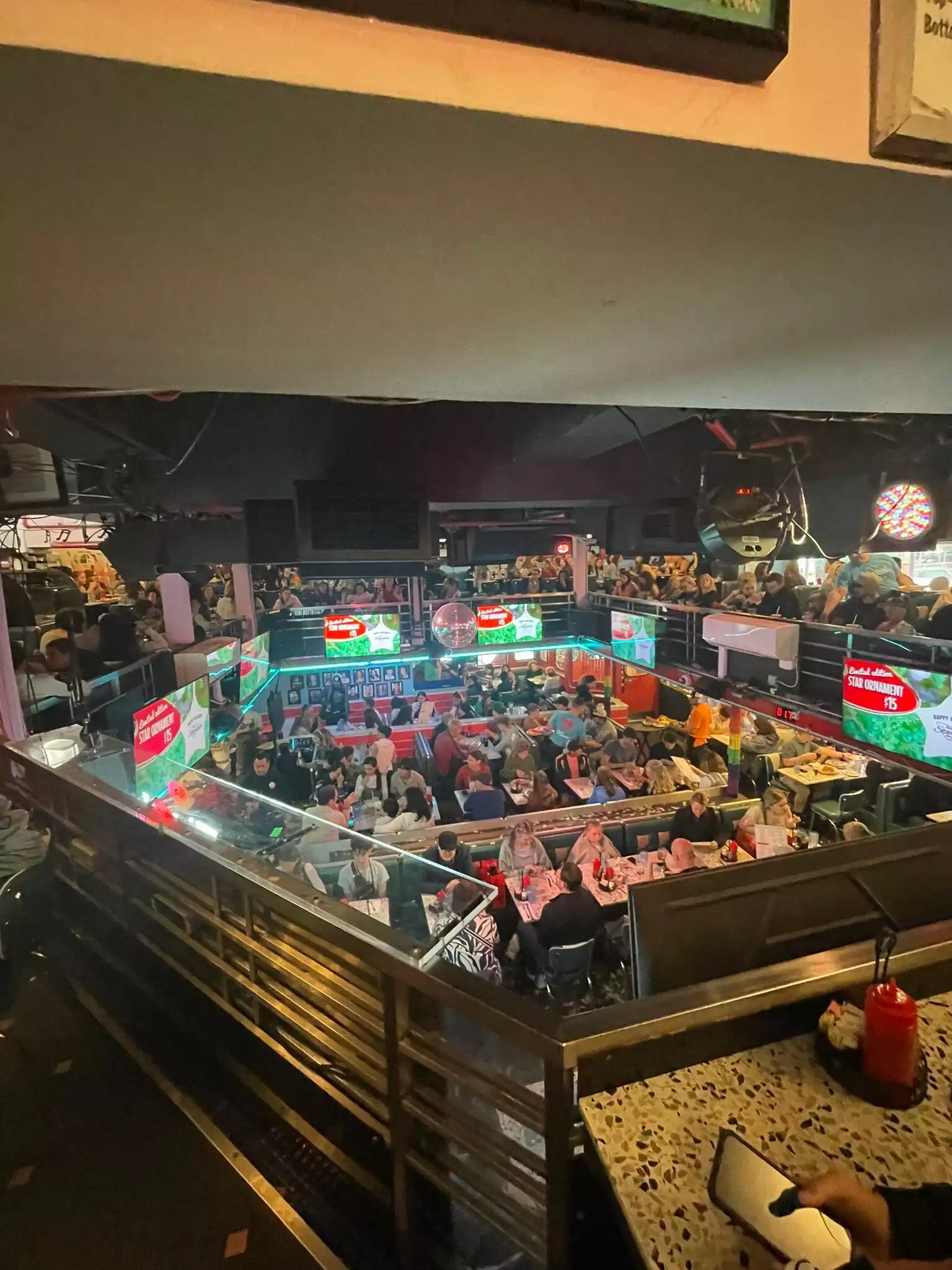 Went here as part of entertainment stop and dinner for evening bus stop in NYC. Live entertainment performers dance and sing above crowd on counter while awaiting & enjoying your meal. Too loud for me. Food served not hot. Consider other venues. Poor seat views facing wall exist…so watch where seated.