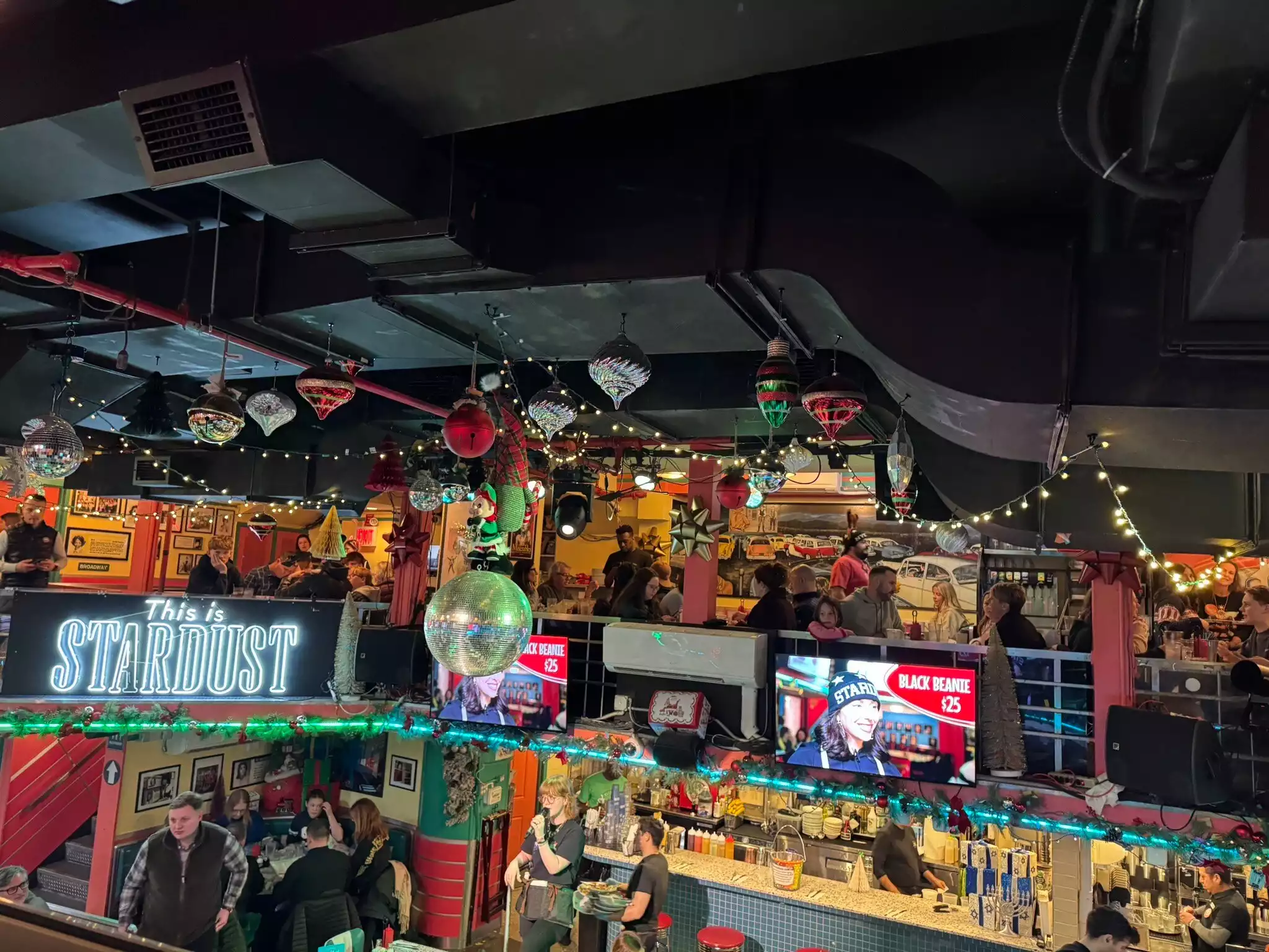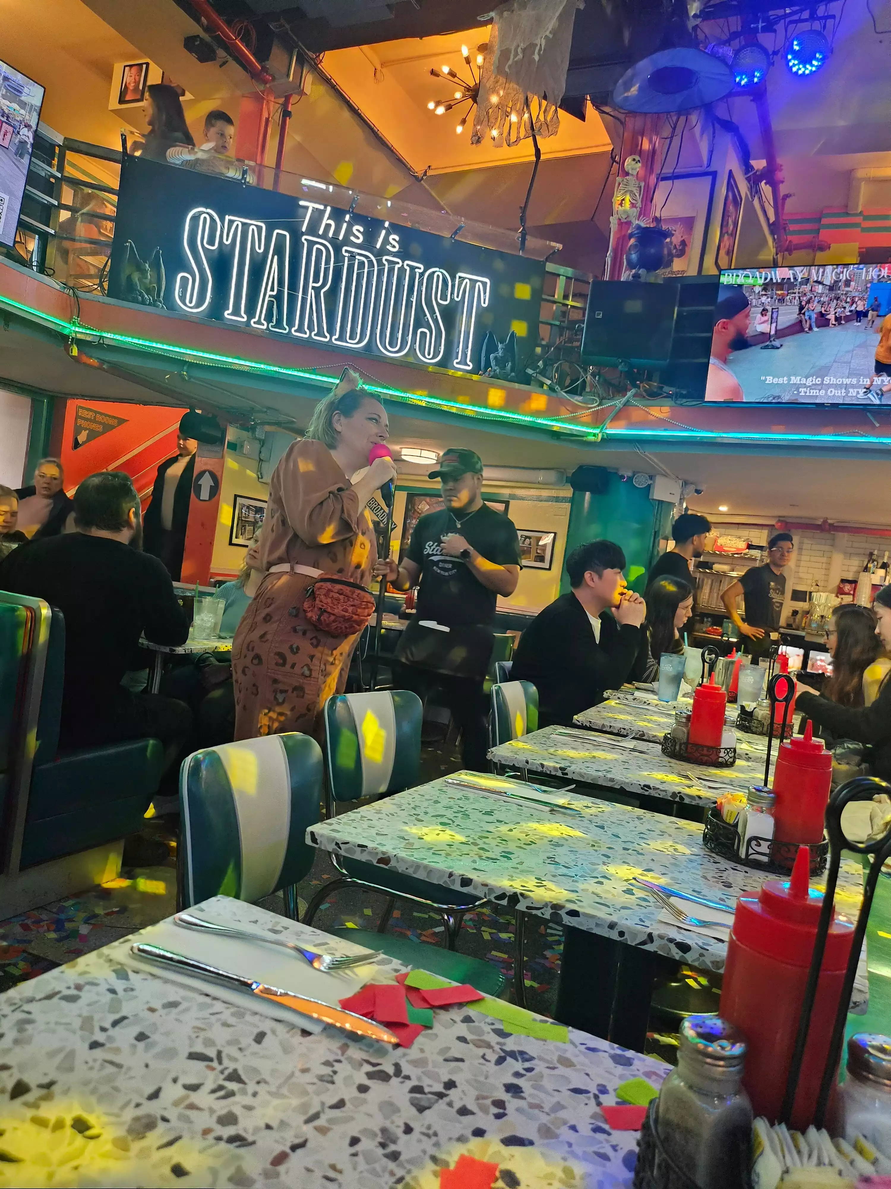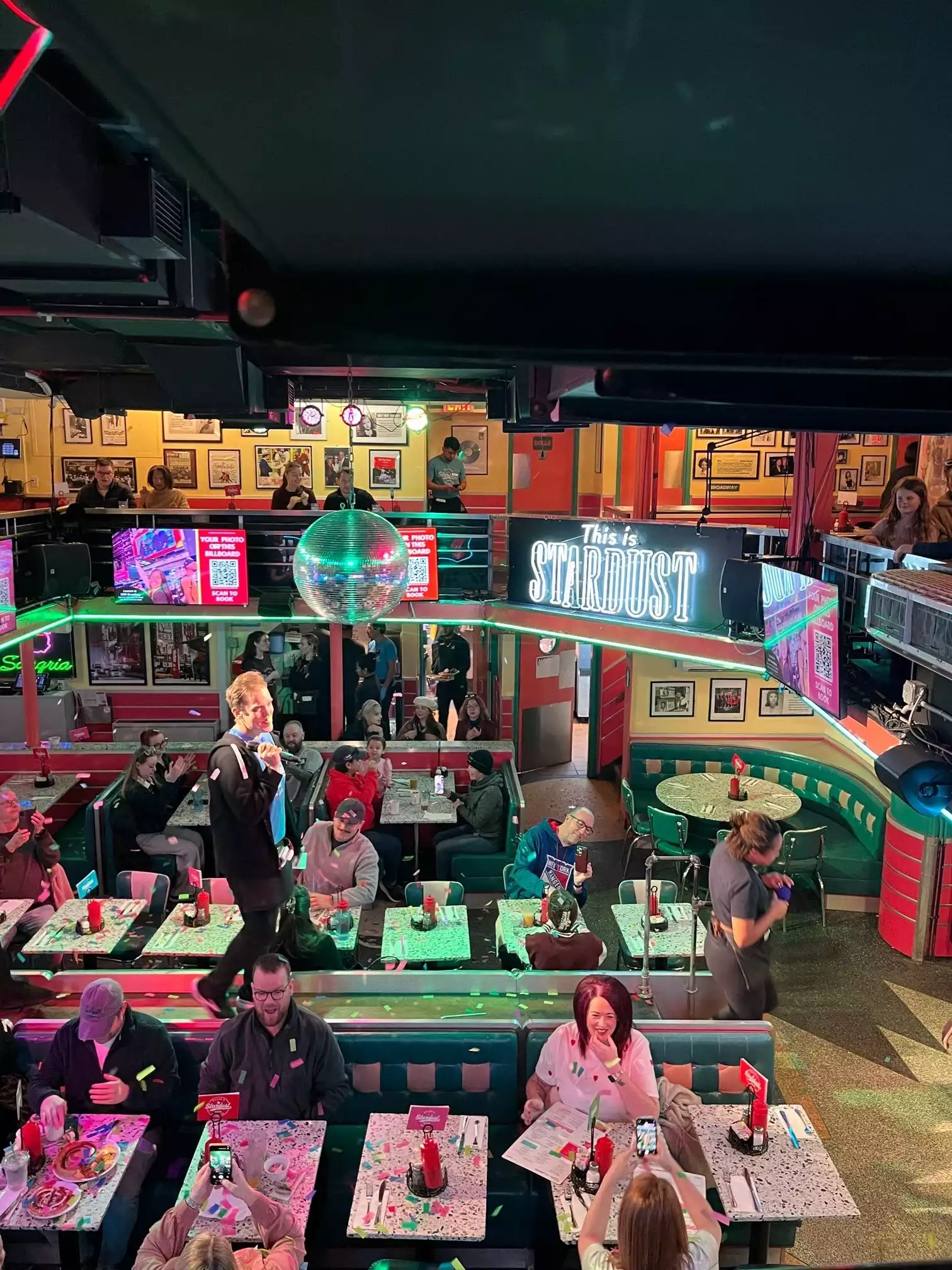 Great visit again to the Stardust diner. Went with my 3 daughters to celebrate my eldest moving to Australia. Staff were superb and although they don’t do requests on this special occasion they did. Thank you to Mollie for doing a great version of Taylor Swifts All too well. Brought on the tears, in a good way. Breakfast / Brunch was huge and tasty and the cocktails were flowing. Great atmosphere provide by all Staff and Performers. Fantastic work and gesture by all at Stardust diner.
