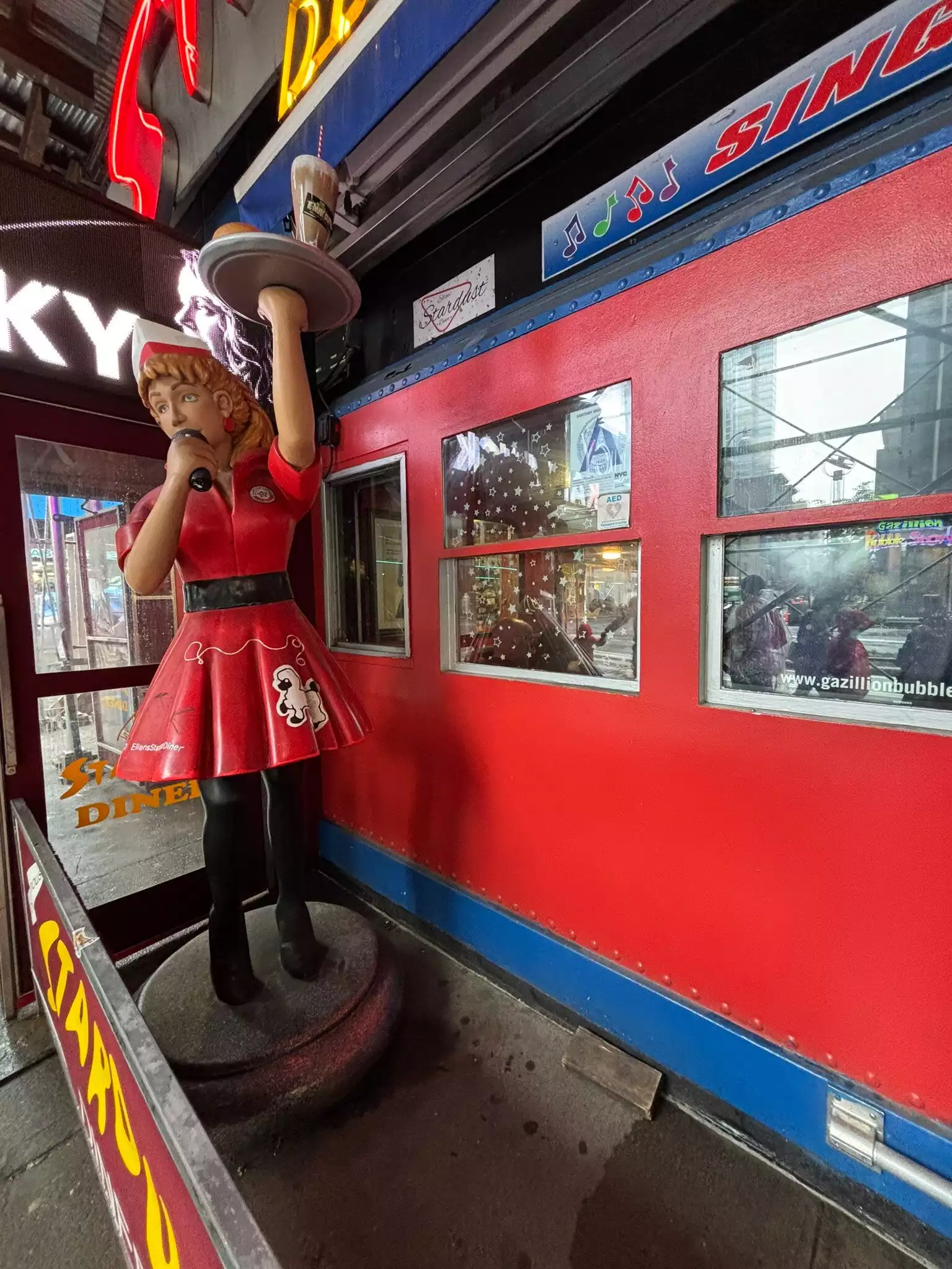 Stopped by this diner for lunch while on vacation in NYC, mainly for the American-style experience—and it delivered on that front! The big draw here is that the service staff are also performers, breaking into song throughout your meal. It creates a lively, upbeat atmosphere that’s definitely memorable. That said, the service was just okay—not unfriendly, but understandably a bit rushed due to the high turnover and busy pace. The food itself was average and quite pricey for diner standards, but I suppose you're really paying for the entertainment more than the meal. Worth a visit if you're after a classic NYC tourist experience with a musical twist, but don’t expect a quiet lunch or great value.