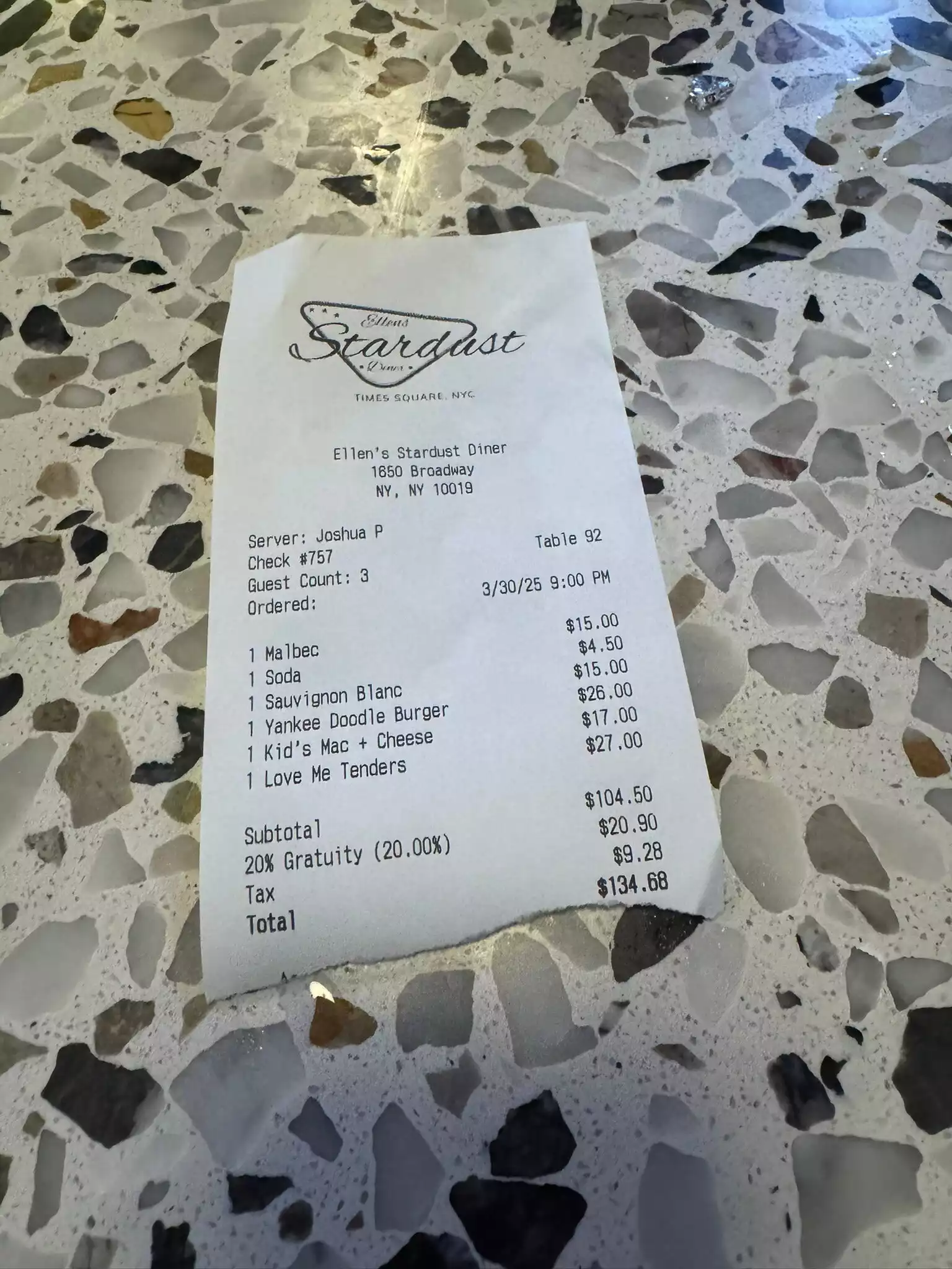 My husband and I chose Stardust diner for our first meal out while in New York. It being a weekday, we weren’t sure what to expect. The entertainment didn’t disappoint! Jen and Isaac both knocked their performances out of the park! They both will likely go far in their career interests! Our meals were cooked to order and served relatively quickly! The restaurant WAS busy at the time we were there… so a slight delay was acceptable. That’s where the good news stops! After our food was served, our waiter COMPLETELY disappeared. I’ve no idea if he clocked out, went home, went on a break, got hurt, got sick, or what! I literally had to ask 4 times (and 4 different people) for our check. When it was finally given to me…. I STILL had to ask, after another 10ish minutes if I needed to pay from my seat or go elsewhere. We never received an apology for the lack of communication/service but… I sure hope they are grateful for the honest paying customers. We definitely could’ve just got up and walked out! Likely my biggest issue is with the staff passing the bucket and ‘asking for tips’ over and above what they earn for waiting tables. I do understand they are trying to ‘make it’ on broadway… but passing the bucket around 3 times in less than an hour is quite excessive & VERY unnecessary!