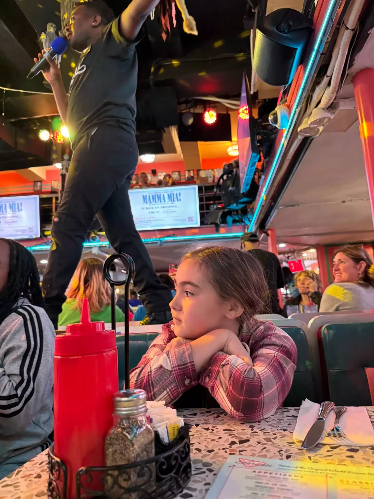 I think this is a 'must' at least once when visiting Time Square when attending a Broadway show. We had it as a 'plan' to eat at after seeing "The Outsiders." I assumed on a busy, summer night that it would be hard to get into, but we decided to try it out anyway. The line had about 20 people in it when we arrived and the lined moved fairly quickly for the time of night (after the evening performance of Outsiders). We were seated in less than 30 minutes which was a huge surprise to me. This fun, exciting diner with performers is an absolute blast. The menu is large and easy to choose yummy, American diner fare. It seemed a bit more pricey (I am from Los Angeles where it is comprable to pricing in New York City) than I would've expected, but with a location in Time's Square and its popularity I settled on it making sense. I didn't think twice about the price as I wanted to experience the diner. Each of us enjoyed the food. My daughters loved the Mac and Cheese Burgers. The performances were amazing among the servers who not only perform amazingly, but work so hard as servers. Be aware they do pass a bucket to tip the performers to support their servers. I was happy to donate to support their art. They have a little merchandise area to purchase memorabilia which was nice. The stickers were free! Be sure to get one!