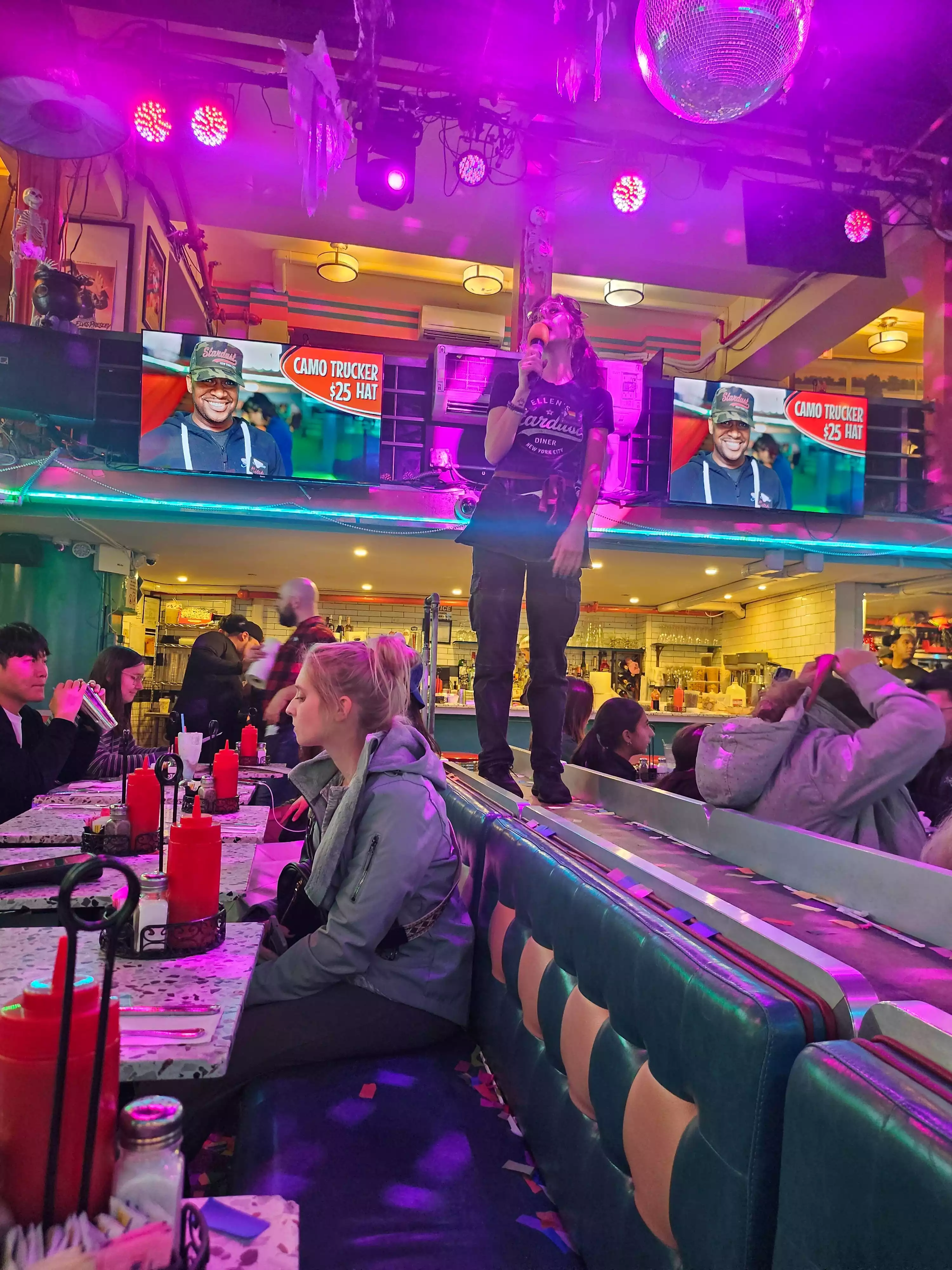 The place is exactly what you think, an American diner (with classic American dishes, nothing exceptional) where every waiter intersperses himself singing. The format is very funny and the singers are very good, you will get excited. Beware that as soon as you finish eating you will have the bill and you will have to leave, as it works in all US restaurants. Average prices. I queued about an hour to get in for dinner and they told me that at every hour of the day and night it is like this.