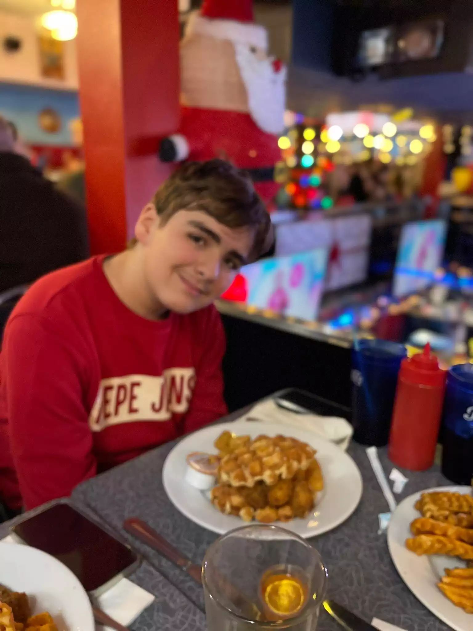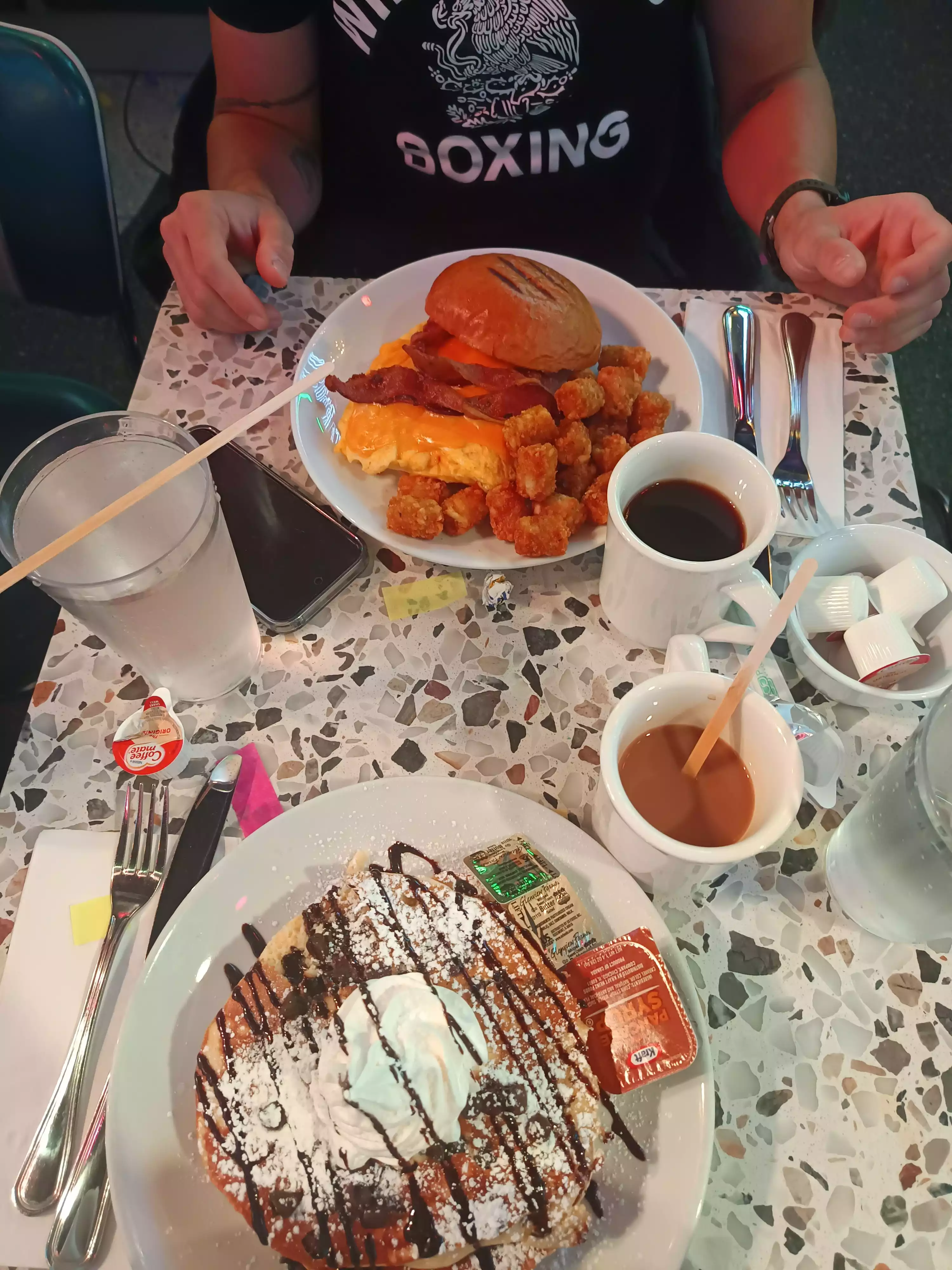 Breakfast we did not que long for a table the shame thing was we was put upstairs with kids this was hard as we was on like a high booth which seemed cramped for the 6 of us but we made it work, the food was extremely large sadly we had so much waste if going with young kids they can share we could of ordered half of what we had and probably still left some. The singers walk round so the kids were very entertained and there voices were incredible.