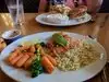 As with others, the restaurant was close to our hotel, so we walked over. Large menu (we did see a vege. burger listed). Both of our plates were of generous portions and tasty. It was not busy when we arrived, but by the time we left; the lone waitress was very busy; and there was a slightly longer wait time that usual to have our credit card transaction completed. Overall, the experience was a good one and we would return again when in the area.