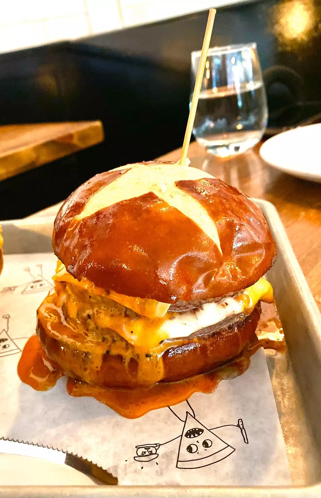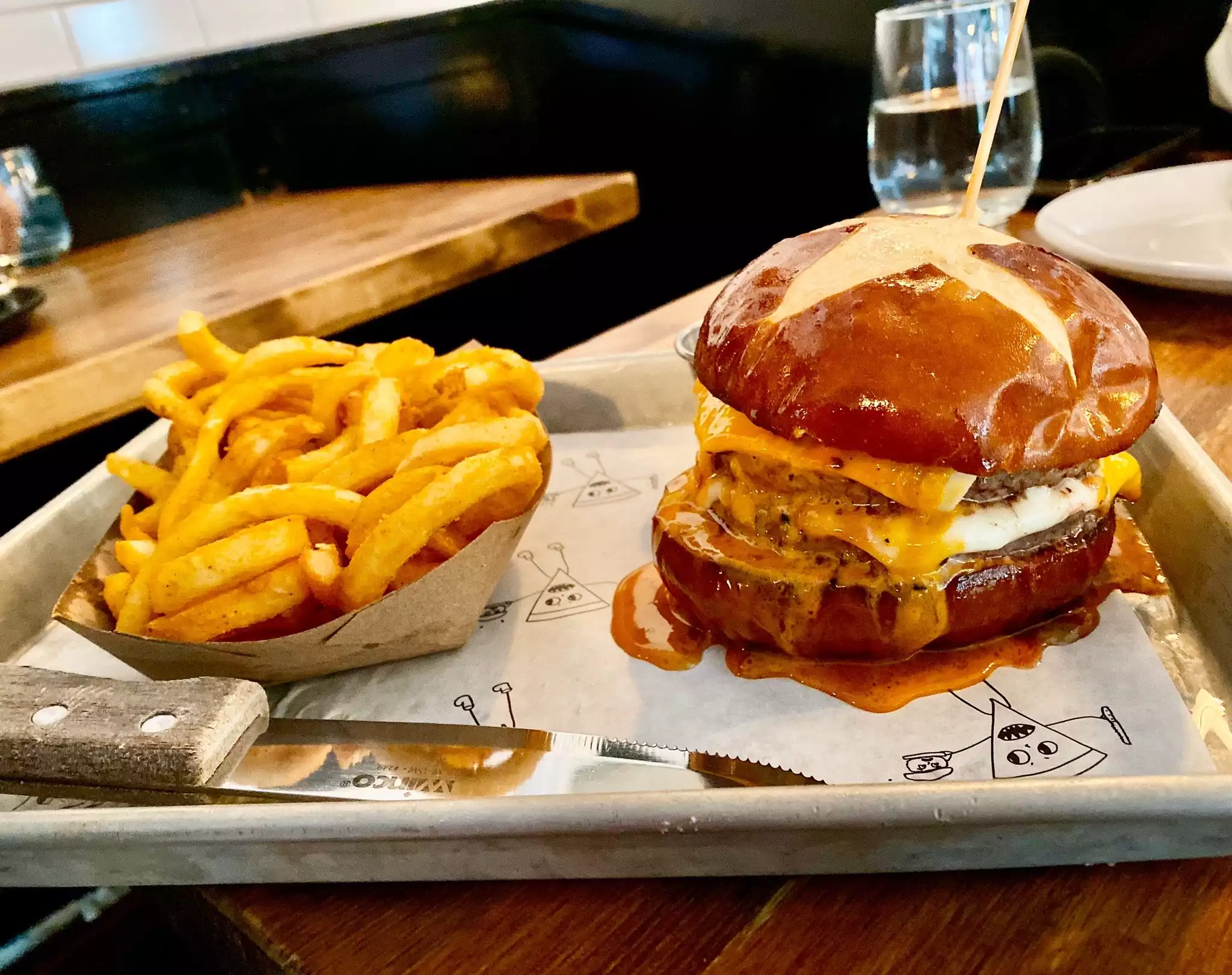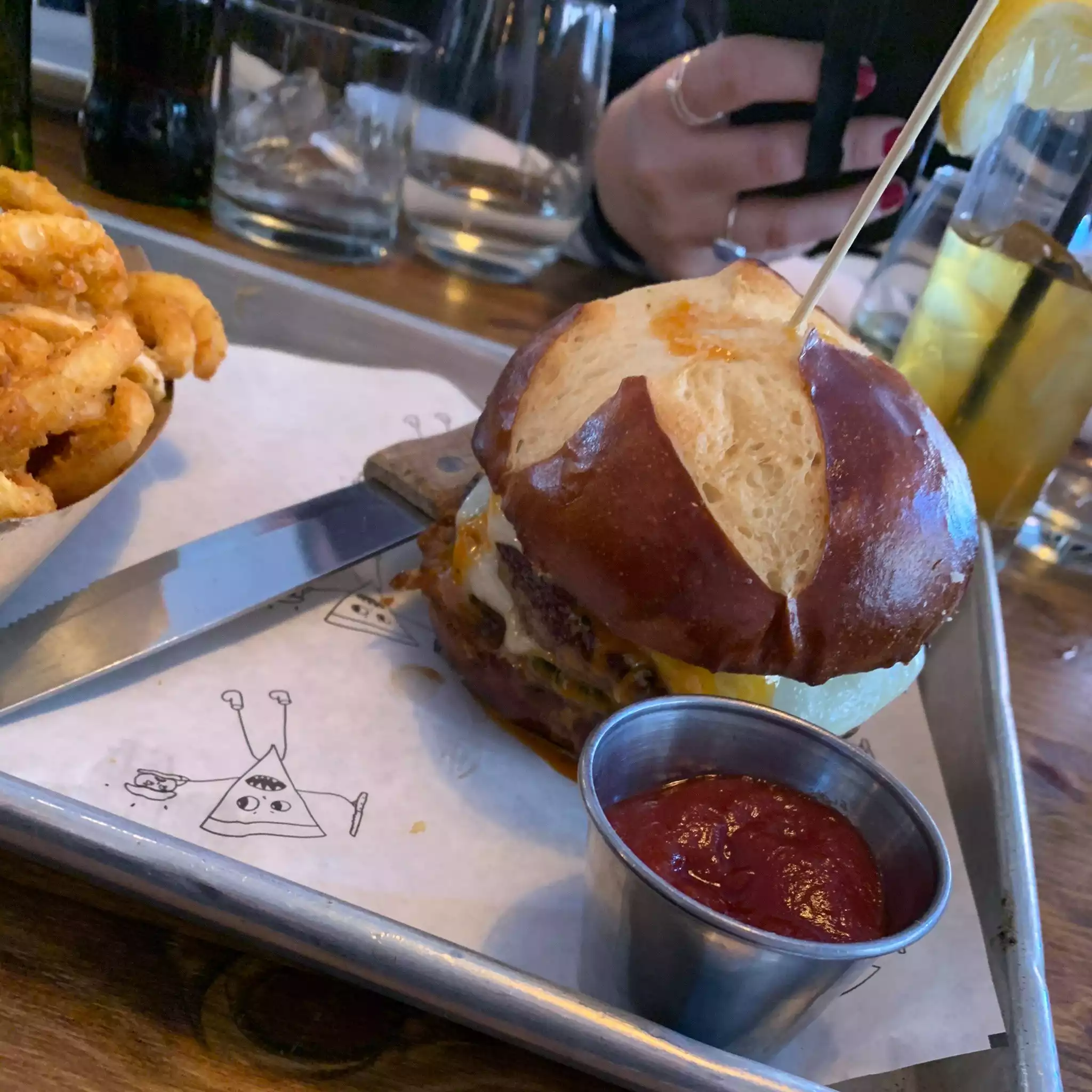 Had a family dinner here in January. We made a reservation, showed up a little early and the host was kind enough to seat us. The restaurant has two levels - both small. The main level is windowed with a small bar that gives the vibe its for eating not for drinking, the lower level - a little dungeon like but cool looking - dark and bricked with a small room for private parties. It’s worth noting there was no cell or wifi svc down stairs which is an issue if need connectivity. The waitress declined to share the wifi password. We didn’t press. The place is known for their hamburger - a double patty with cheese and onions and their sauce on a pretzel bun served with waffle fries. Burger was very filling. Taste was good - not the best I’ve had. I felt it was over- oniony, over cooked (they didn’t ask about temp preference) and under-salted but overall was a good burger. Fries were very good. We shared some apps - cauliflower in chili sauce was meh. My dinner companions shared a couple of pizzas - both gluten free. Was a relatively thick crust square pizza (Detroit style? Sicilian?) . Reviews were good and for me, a gluten eater I felt was a pretty good pizza. Drinks were good. I was a little ticked they up charged me for an old fashioned. The one on the cocktail special menu was $15 they charged be $17. They were out of the bourbon they use on the cocktail menu. I subbed makers. Clearly not top shelf and the substitution wasn’t my fault. I feel a $2 money grab just brings down the experience. Worthwhile place to go though. Young crowd and with good energy. Would recommend.