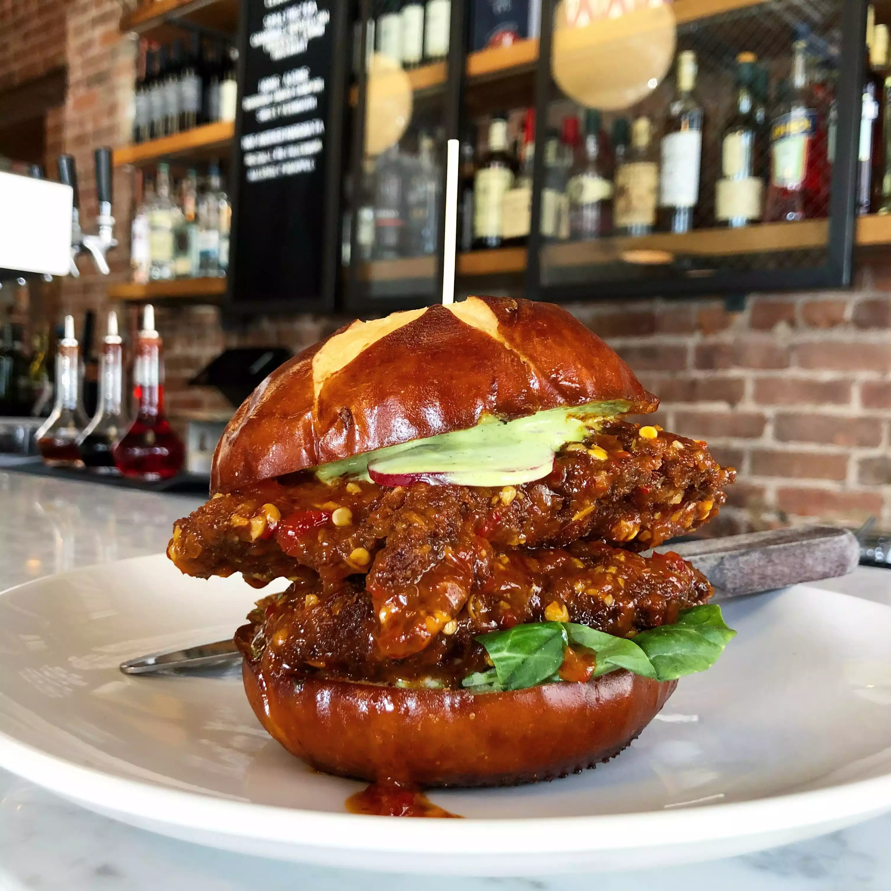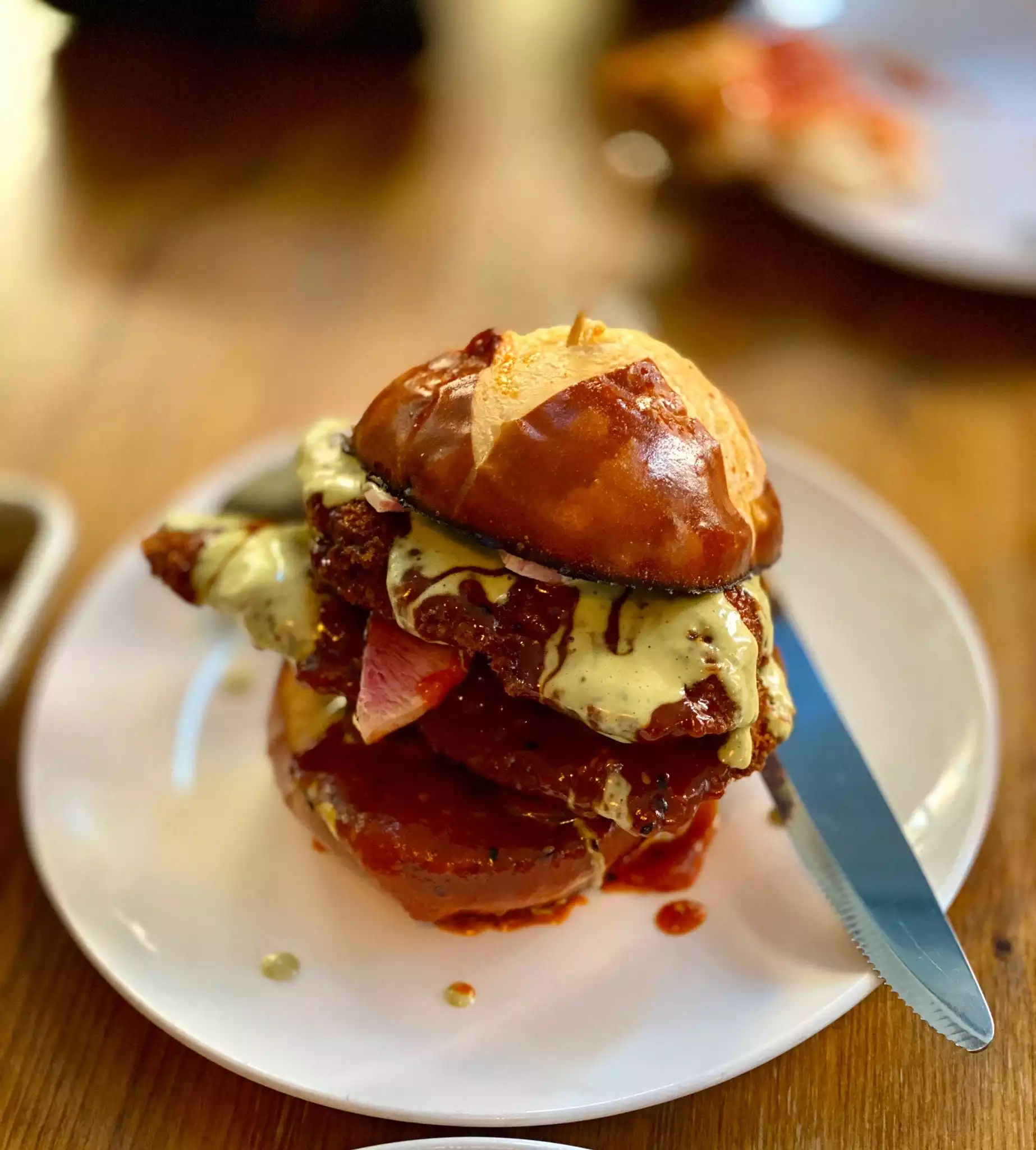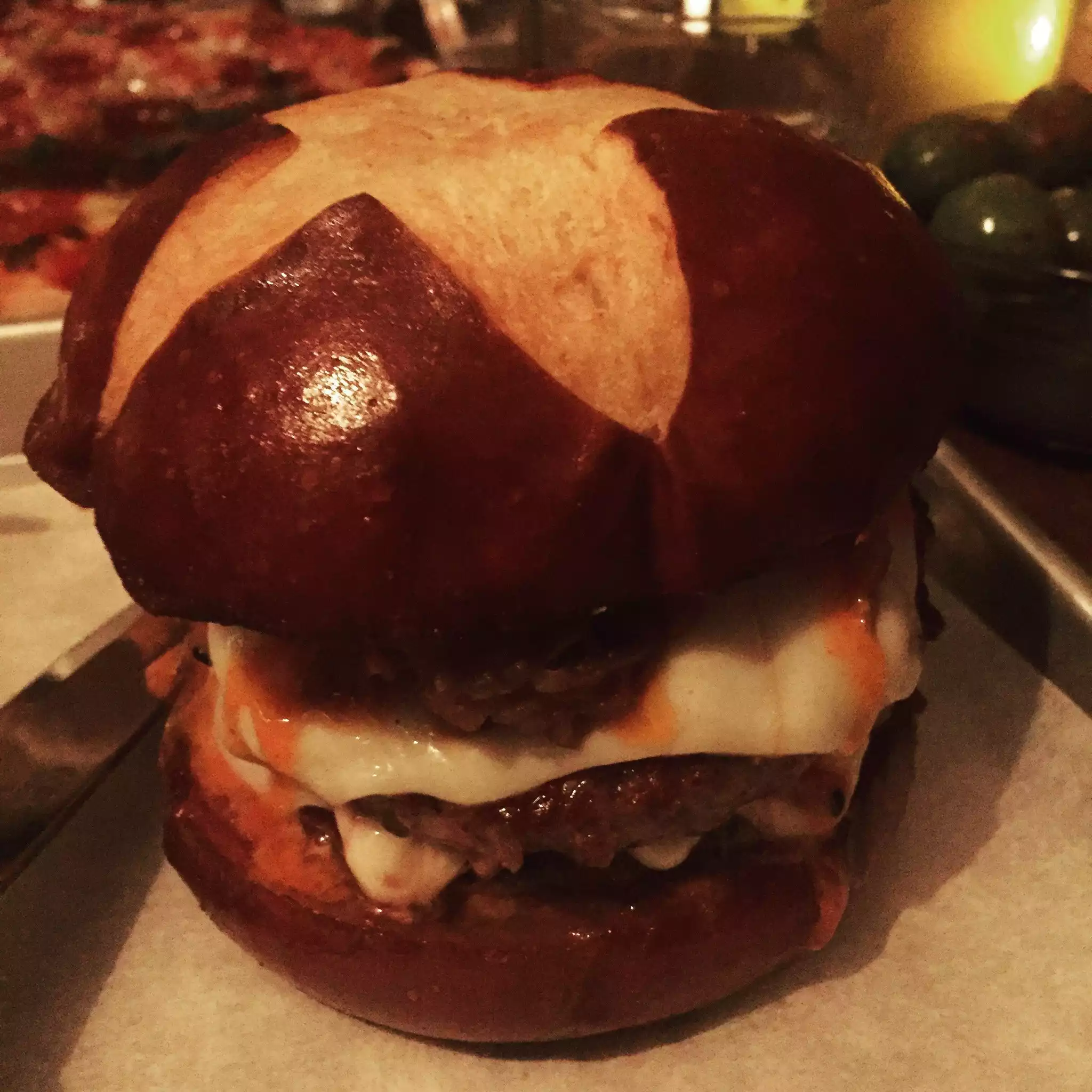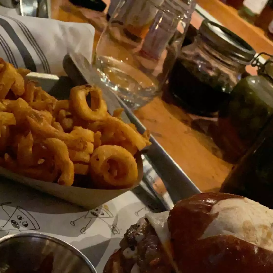 Had a family dinner here in January. We made a reservation, showed up a little early and the host was kind enough to seat us. The restaurant has two levels - both small. The main level is windowed with a small bar that gives the vibe its for eating not for drinking, the lower level - a little dungeon like but cool looking - dark and bricked with a small room for private parties. It’s worth noting there was no cell or wifi svc down stairs which is an issue if need connectivity. The waitress declined to share the wifi password. We didn’t press. The place is known for their hamburger - a double patty with cheese and onions and their sauce on a pretzel bun served with waffle fries. Burger was very filling. Taste was good - not the best I’ve had. I felt it was over- oniony, over cooked (they didn’t ask about temp preference) and under-salted but overall was a good burger. Fries were very good. We shared some apps - cauliflower in chili sauce was meh. My dinner companions shared a couple of pizzas - both gluten free. Was a relatively thick crust square pizza (Detroit style? Sicilian?) . Reviews were good and for me, a gluten eater I felt was a pretty good pizza. Drinks were good. I was a little ticked they up charged me for an old fashioned. The one on the cocktail special menu was $15 they charged be $17. They were out of the bourbon they use on the cocktail menu. I subbed makers. Clearly not top shelf and the substitution wasn’t my fault. I feel a $2 money grab just brings down the experience. Worthwhile place to go though. Young crowd and with good energy. Would recommend.