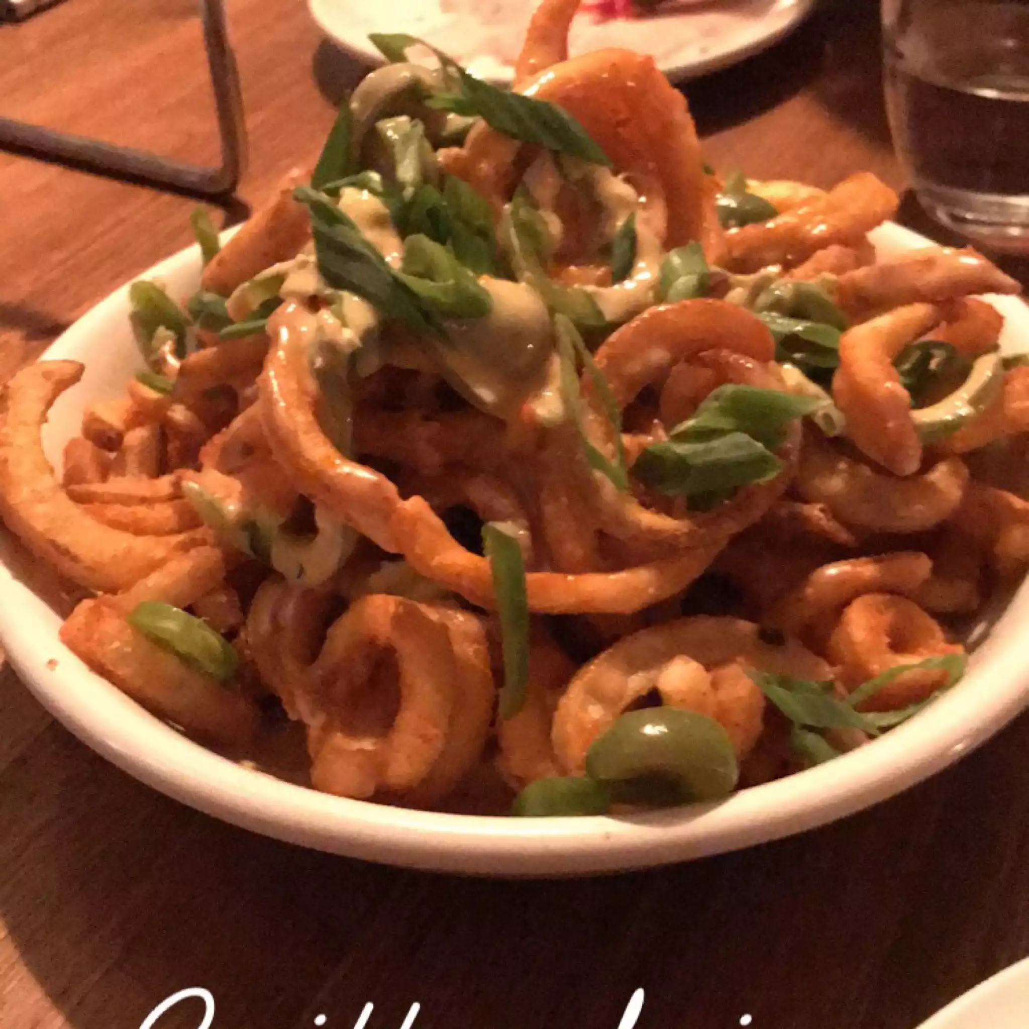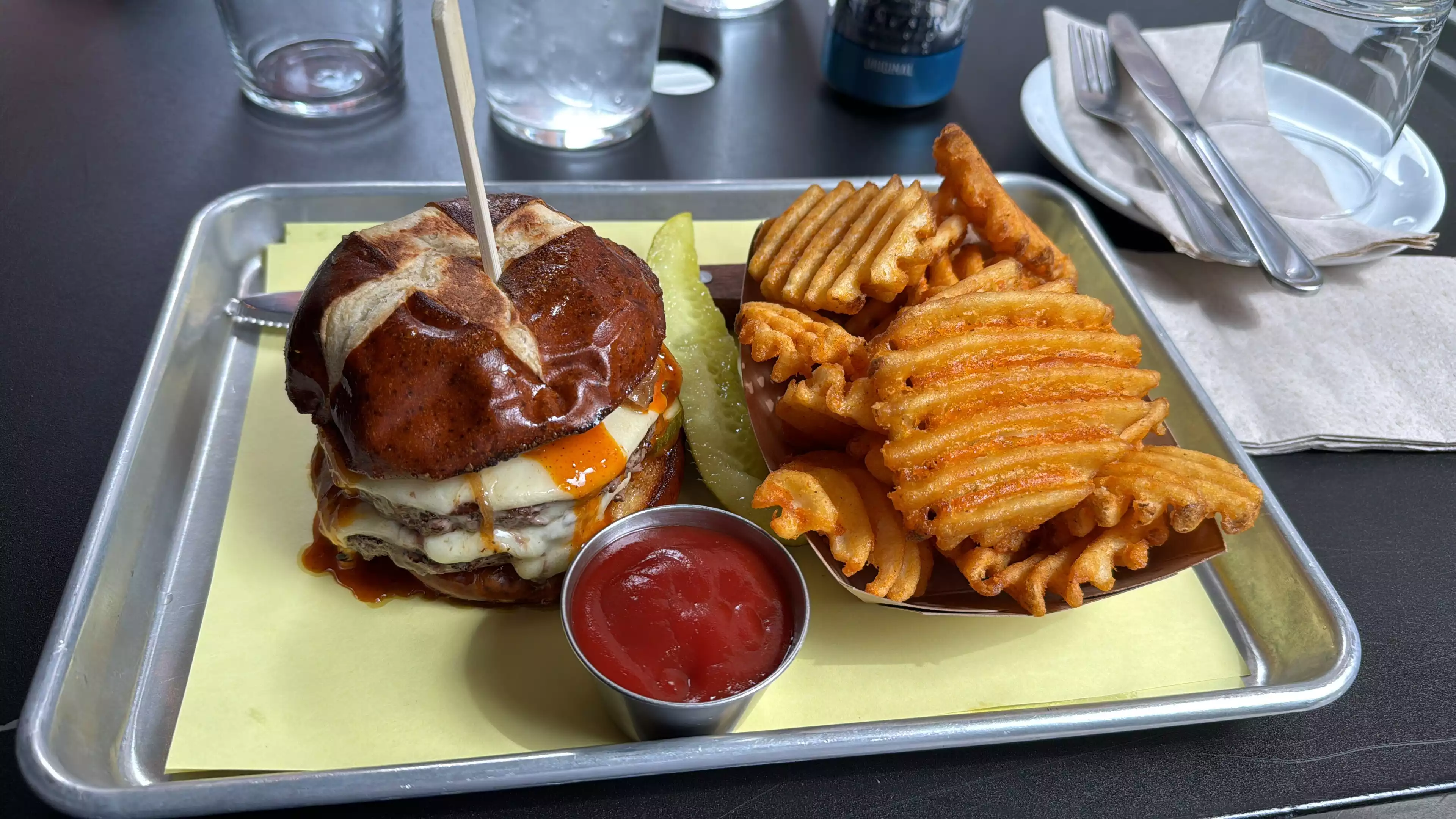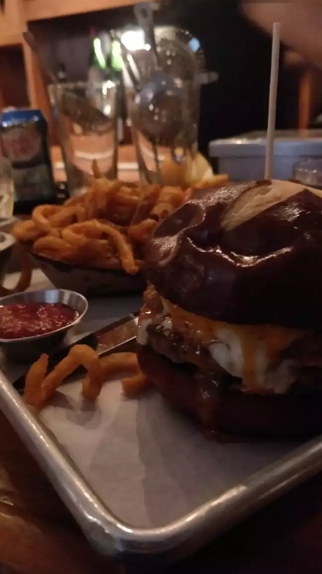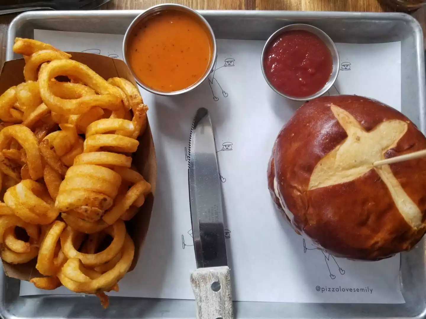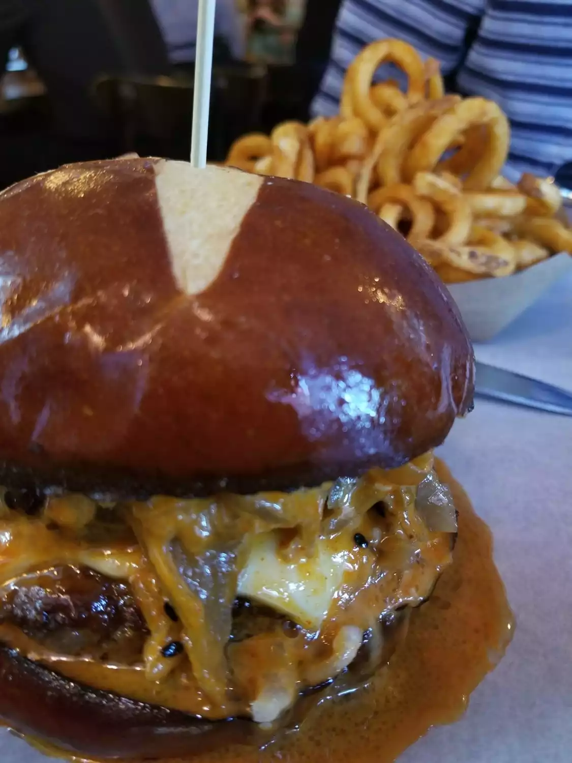 This place has an incredible double stack burger, delicious... with their proprietary dressing and prepared in a pretzel bun. Quite original! The curling fries were also very good.