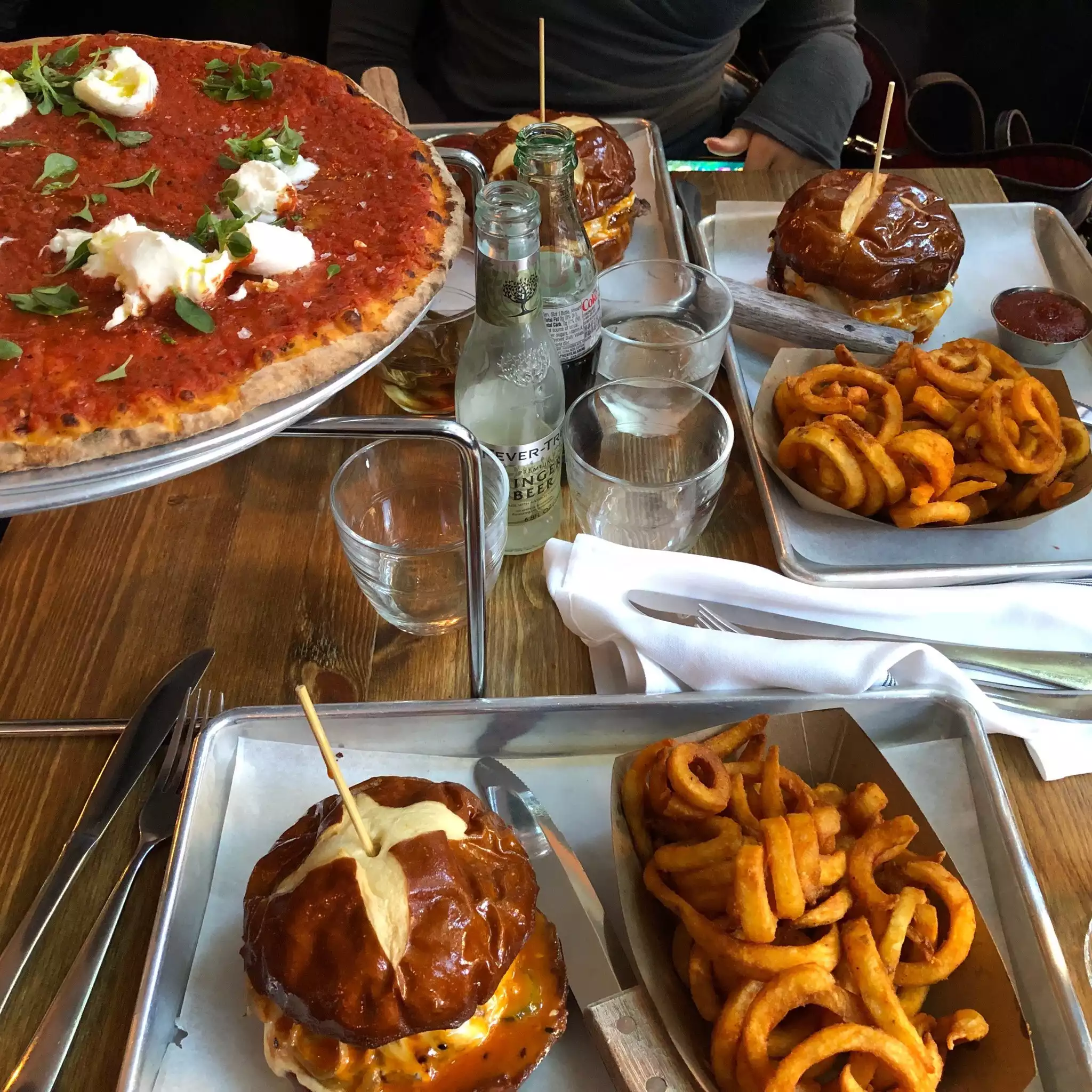 This place a phenomenal burger and great pizza! The sauce on the burger enhanced the juicy flavor, and was amazing! Many pizza choices, so we had a “Detroit style” spicy pepperoni, and a white pizza with truffles - both excellent choices. Sometimes you can caught up eating trendy or exotic food in NYC, but other times you just want an great burger and slice - you get both of those here.