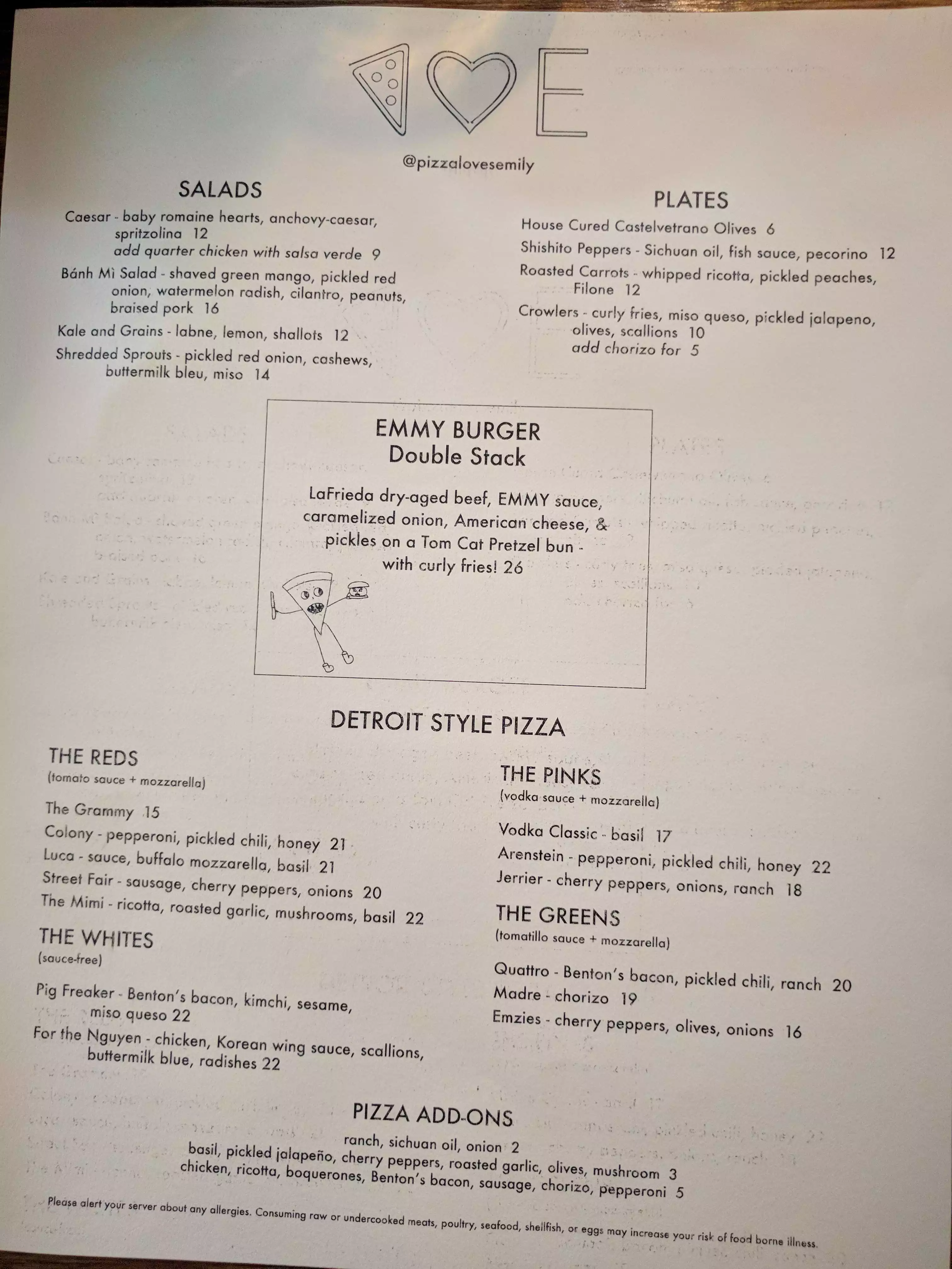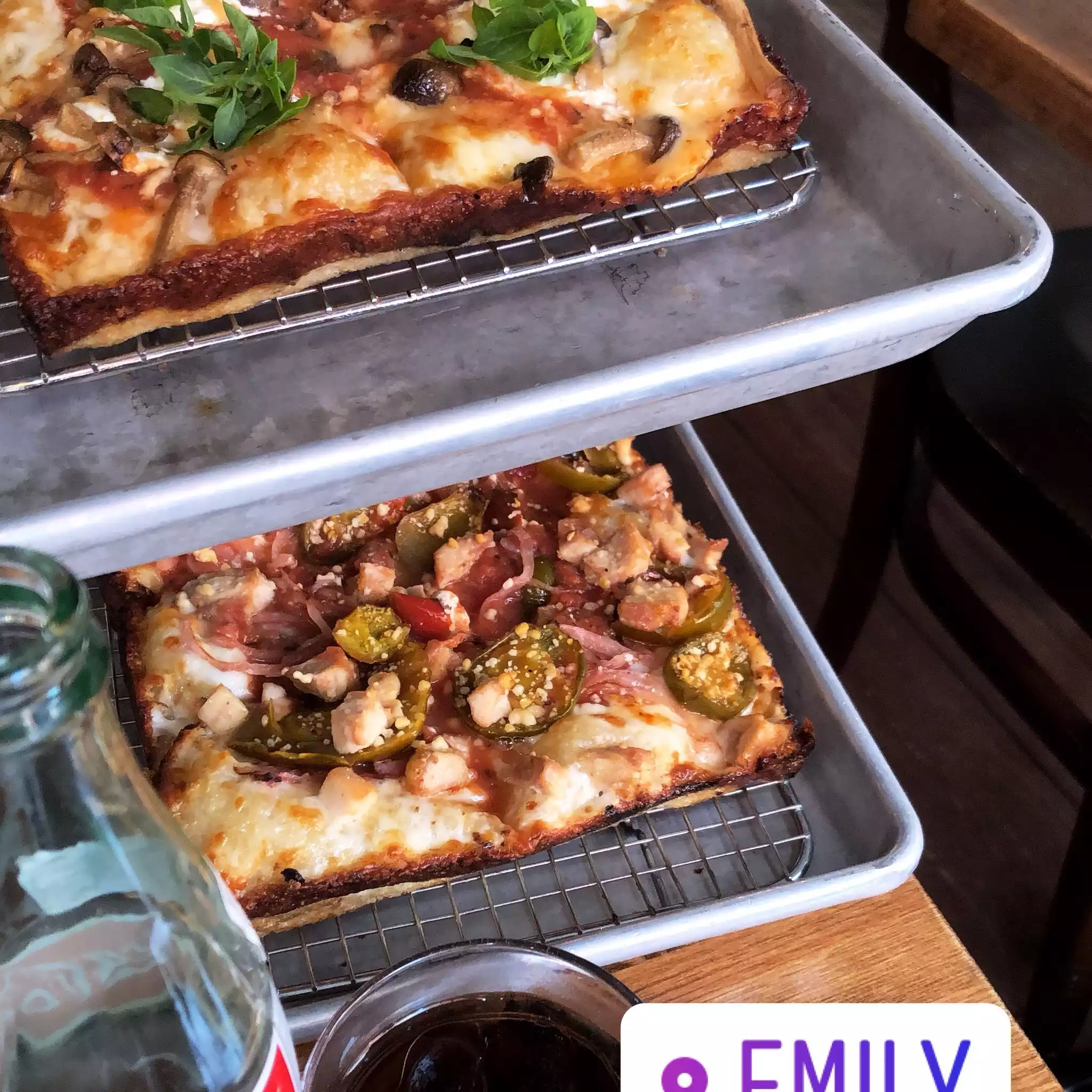 We weren’t sure what to expect when we wandered into Emily early on a Friday evening. Seated immediately in the cozy downstairs. We were pleasantly surprised to see the pizza is Detroit-style - our favorite. And it certainly delivered. Baked to perfection. Also had the kale salad, which was yummy. One pizza and one salad was plenty for the two of us. Highly recommend!