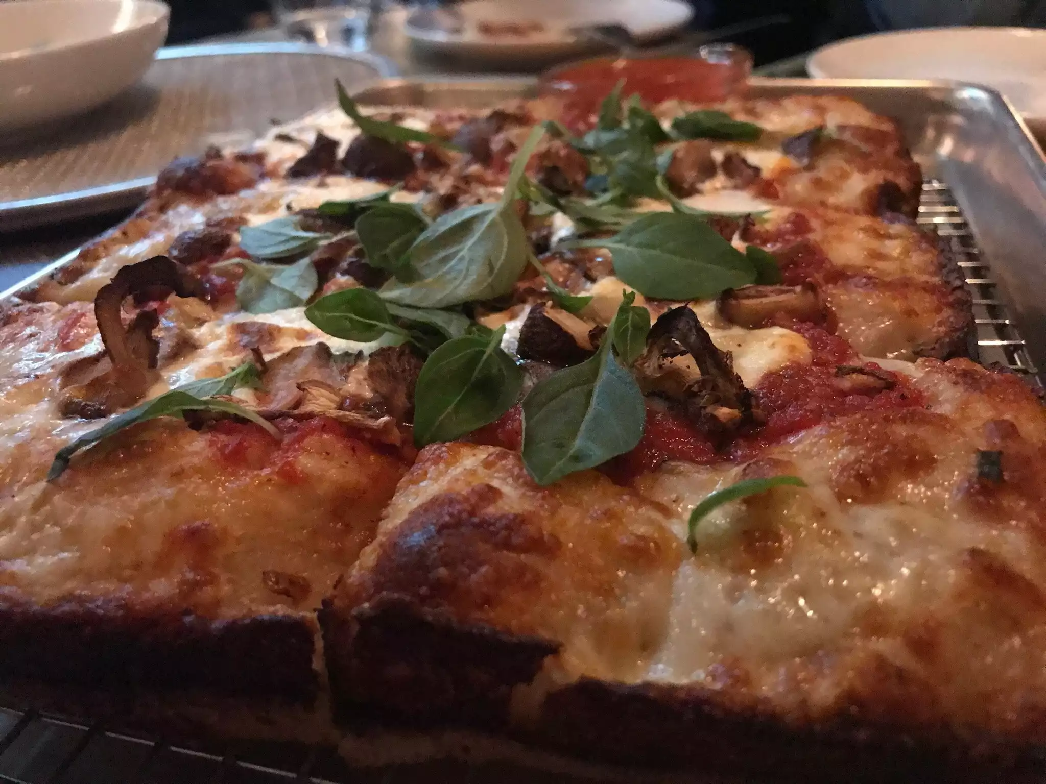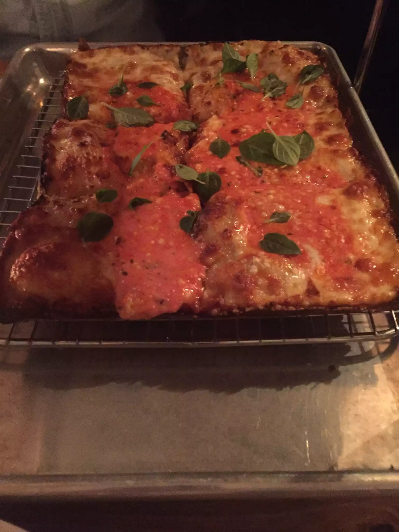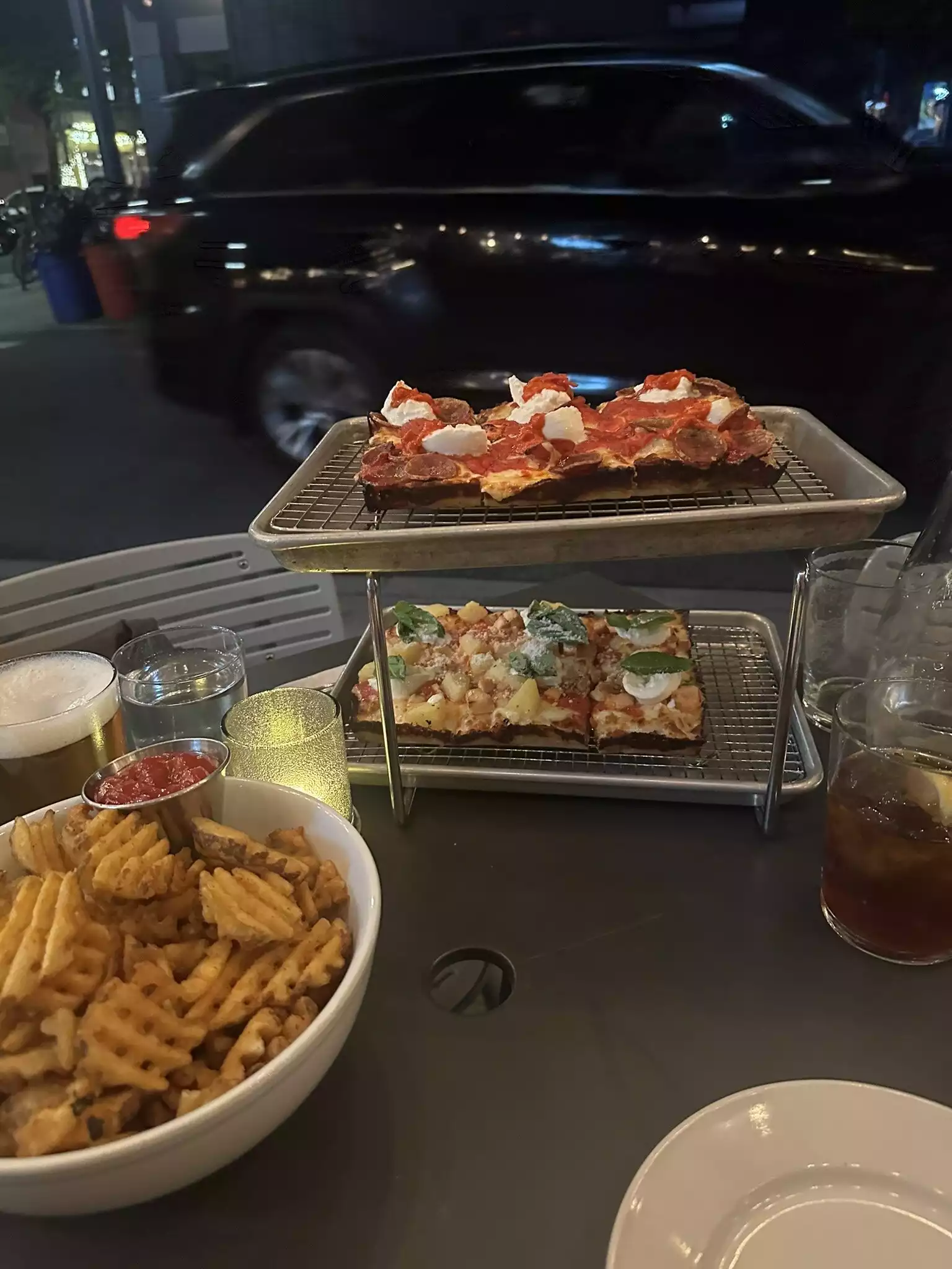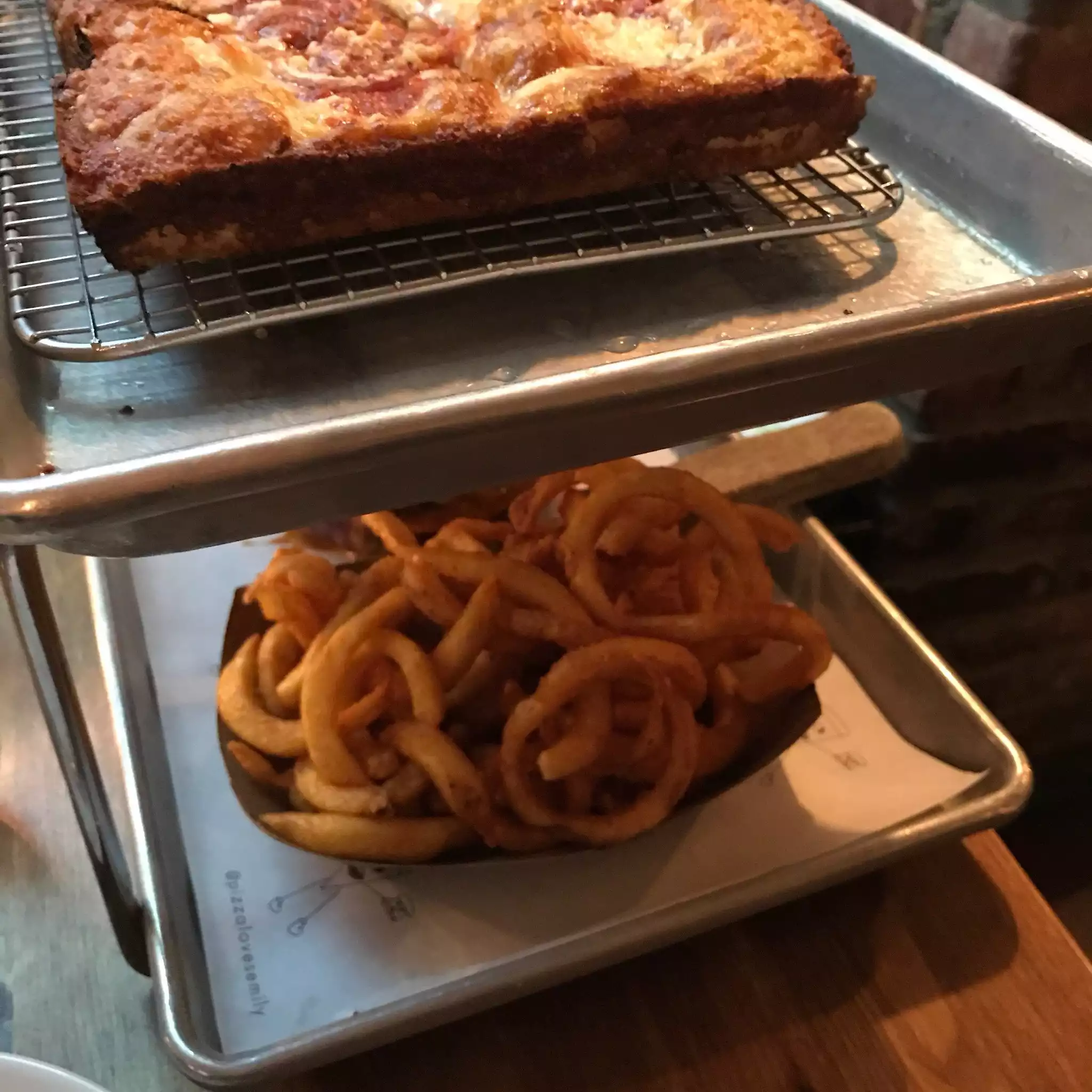 Gerard great things about this place. Looked online at the website and found that they had he normal Neapolitan pizza as well as well as Detroit style. We went hoping to tryin Detroit but the kids wanted the normal style. Apparently it’s now only Detroit style pizza which was a bit disappointing since on line the pictures of the other pizza looked phenomenal. Anyway had appetizers (fries are excellent) and there are other options on the menu including Burger which looked very good. Detroit style pizza was yummy but not for everyone. We loved the vodka sauce one as well as the spicy version.