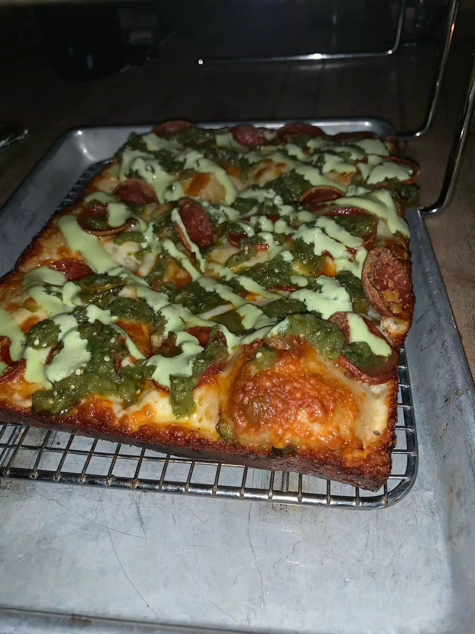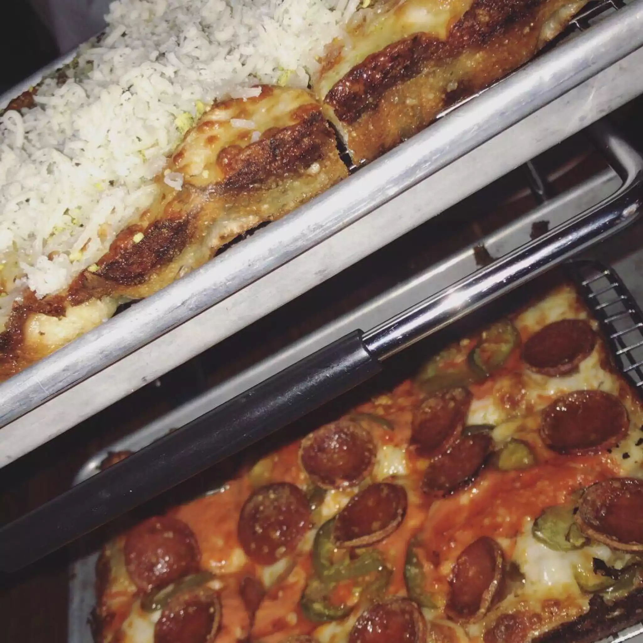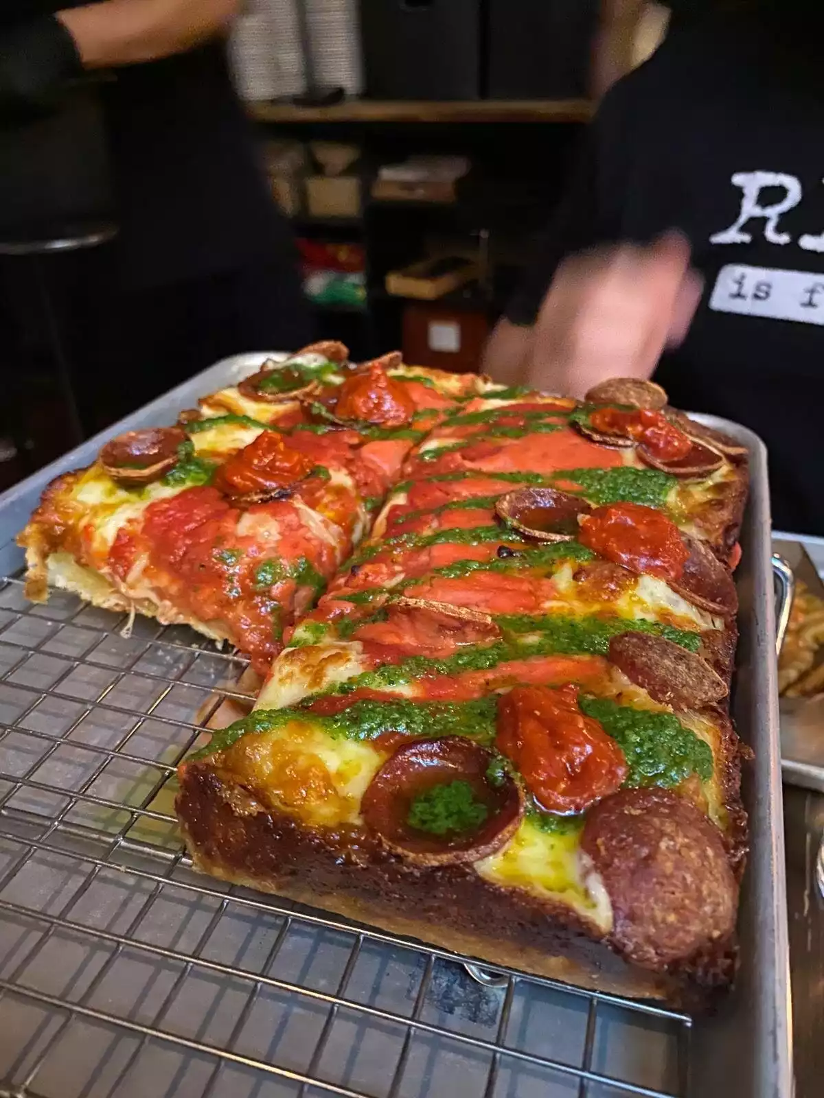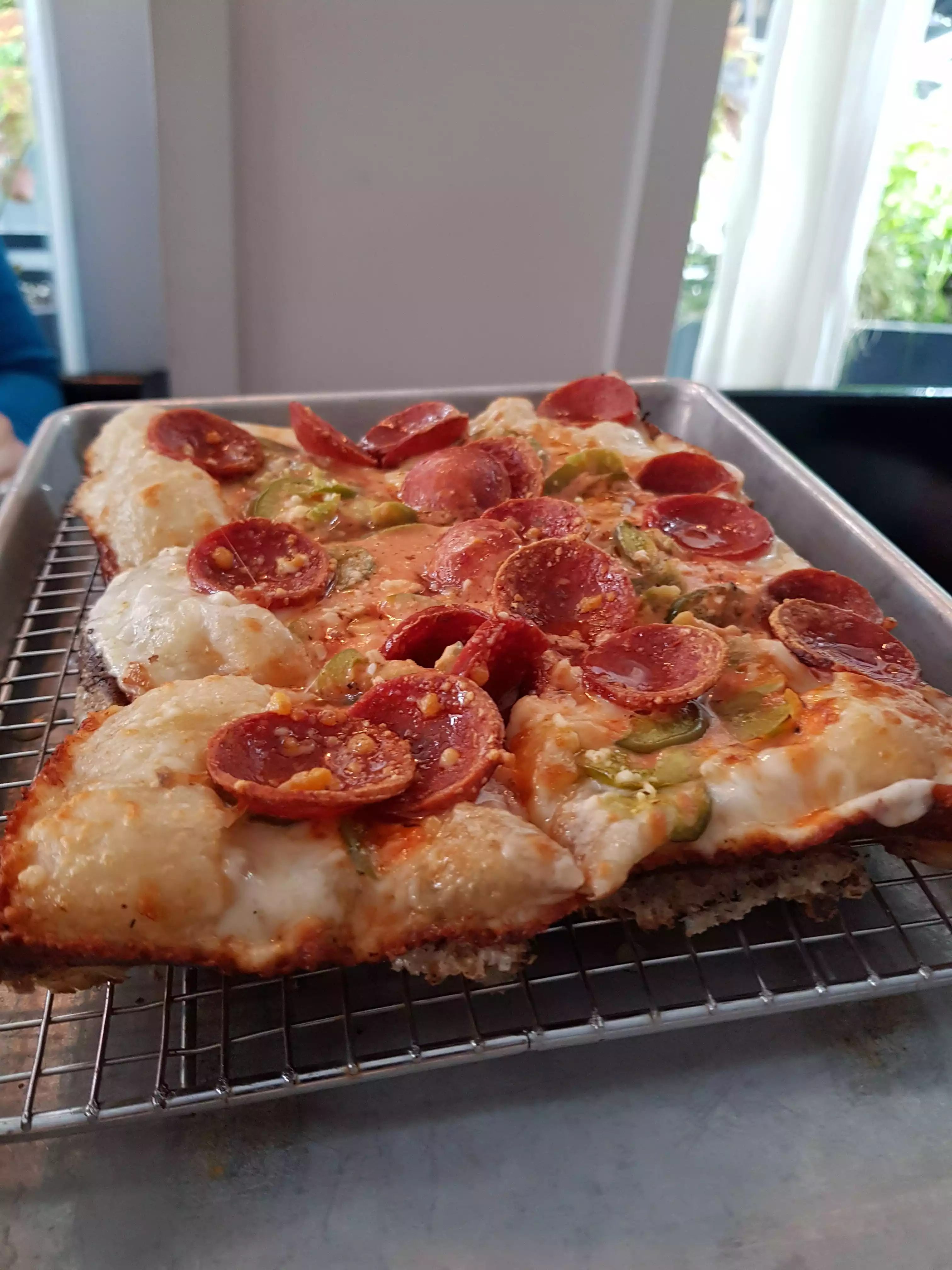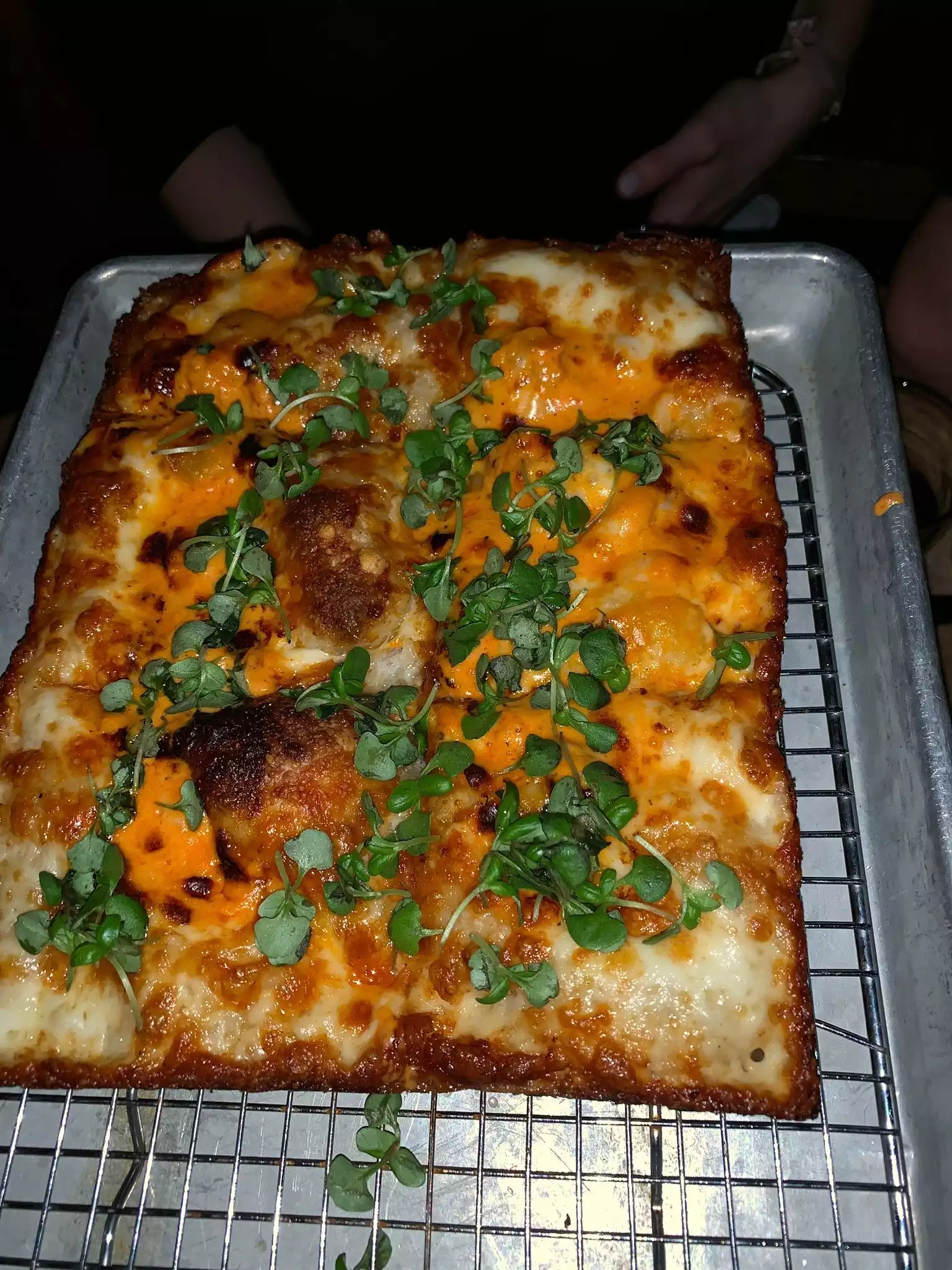 Gerard great things about this place. Looked online at the website and found that they had he normal Neapolitan pizza as well as well as Detroit style. We went hoping to tryin Detroit but the kids wanted the normal style. Apparently it’s now only Detroit style pizza which was a bit disappointing since on line the pictures of the other pizza looked phenomenal. Anyway had appetizers (fries are excellent) and there are other options on the menu including Burger which looked very good. Detroit style pizza was yummy but not for everyone. We loved the vodka sauce one as well as the spicy version.