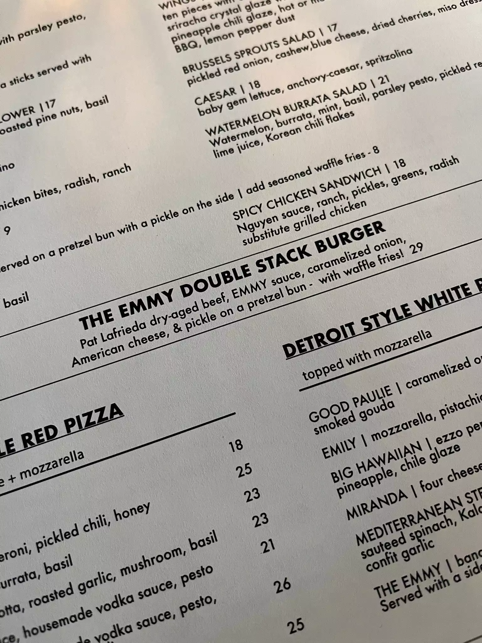 Four of us had dinner at Emily last night and it did not disappoint! When we sat down and got the menu, we noticed the round pizzas weren’t on the menu (aka the ‘Emily’ wasn’t - this is the pistachio, honey, and truffle sottocenere pizza) - naturally we panicked. We asked the waitress and she explained that they don’t have round pizzas every night, but sometimes they’re able to make them square if you know which pizza we want. Luckily they were able to do the Emily for us but square! I would definitely check out the menu online before you go in case this happens - you can throw a name of a pizza at them and they’ll make it anyway. We also highly recommend making a reservation. A few people were turned away who didn’t have reservations. Between four of us, we split 2 pizzas and one burger, and it was the perfect amount of food. While the burger is delicious (and also what they’re famous for), I personally feel it pales in comparison to the pizzas. Overall, the staff were very friendly, the restaurant is very cozy, and the meal was reasonably priced!