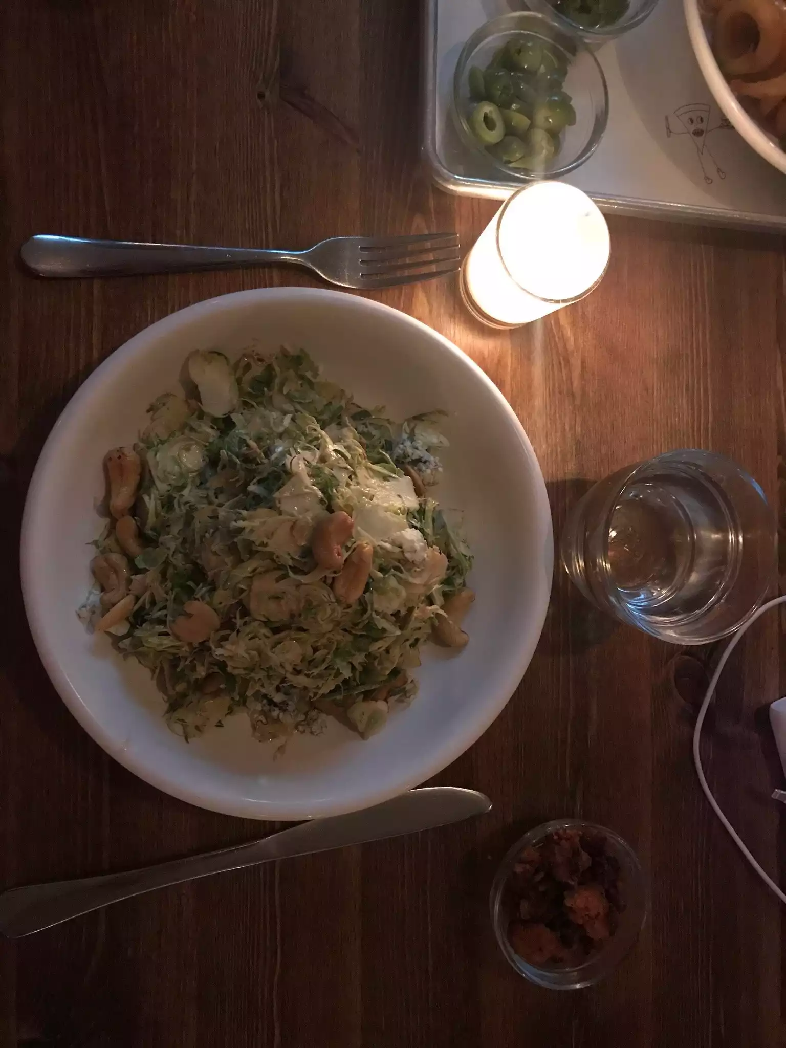 Having recently visited Detroit, it was great to see that we could get to Detroit style pizza in New York City. The vodka pizza I had was much smaller and lighter than the pizza I got at Buddy's in Detroit, but it was still very tasty and nicely crispy. There are plenty of vegetarian options here. We also got the shaved brussels sprouts salad which needed way more depth of flavor. The space is very small and can get very loud so if you don't mind sitting at the bar that would be a much quieter area.