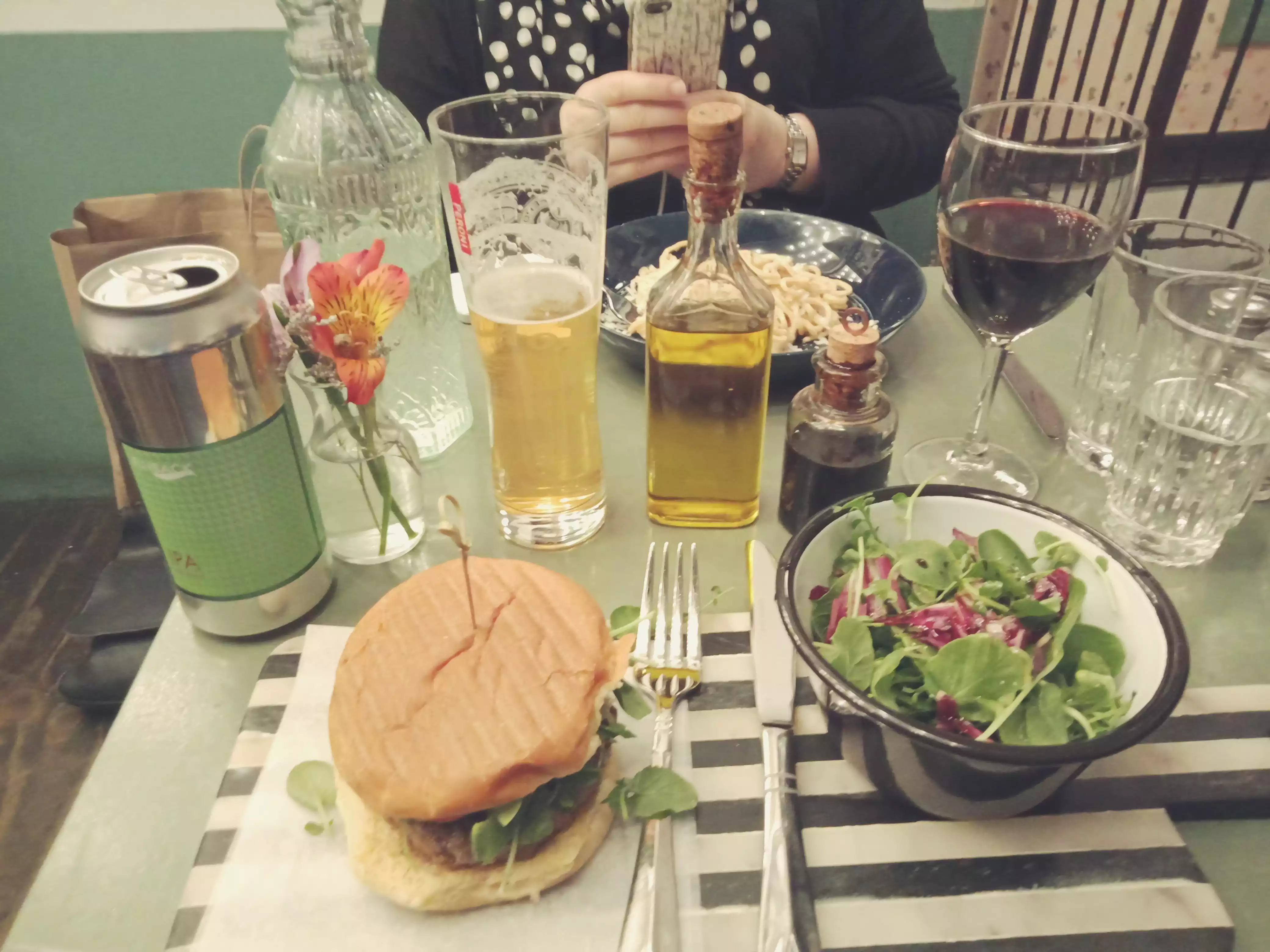 We had been out shopping all morning and ready for a snack . We just happened to pass this cafe it was a welcome stop . 2 glasses of really nice red wine and a burger on 7 grain bun with salad and fried potatoes Very Good . It is a little left of centre has a great feel . Yes we will go back !