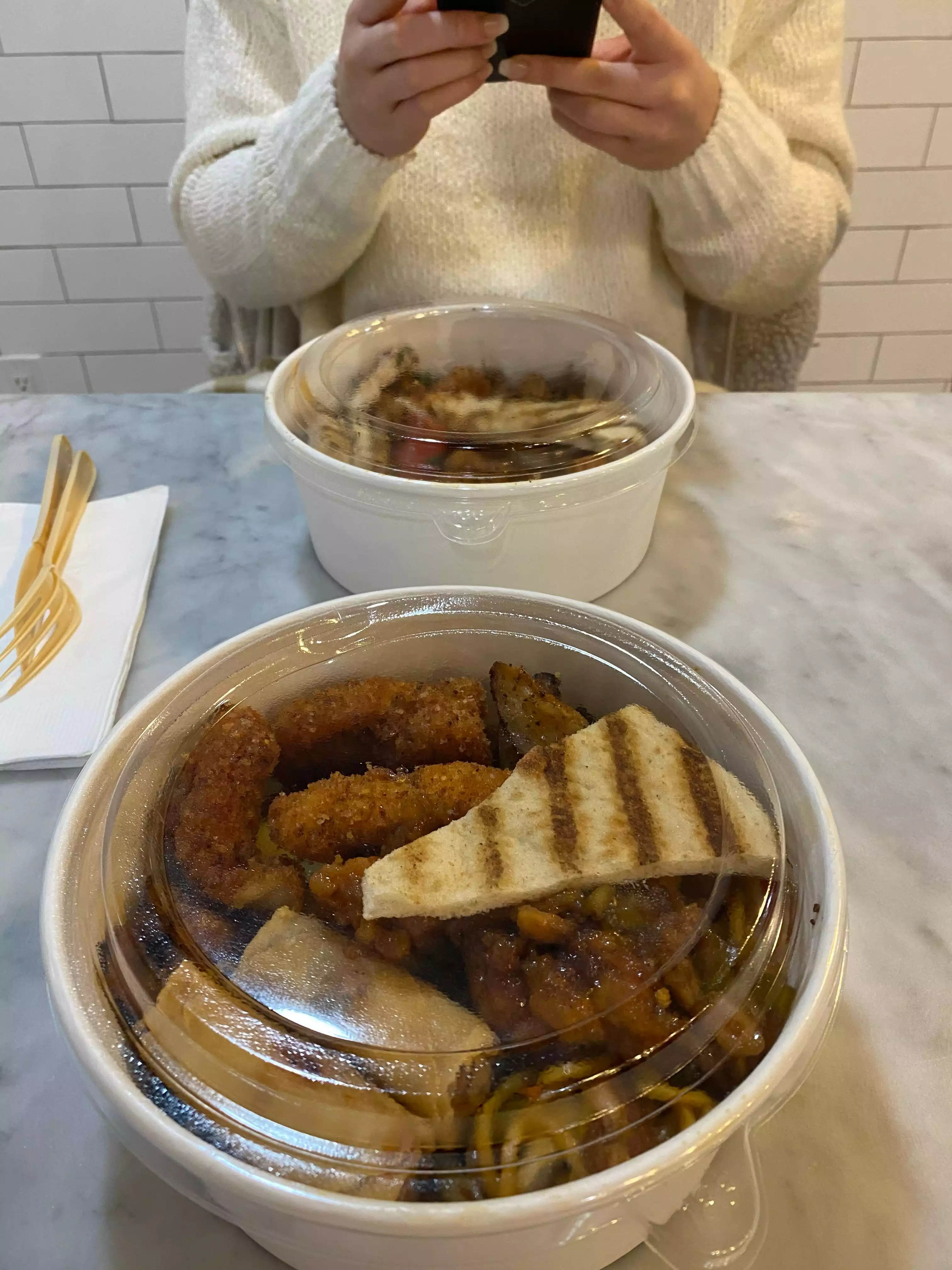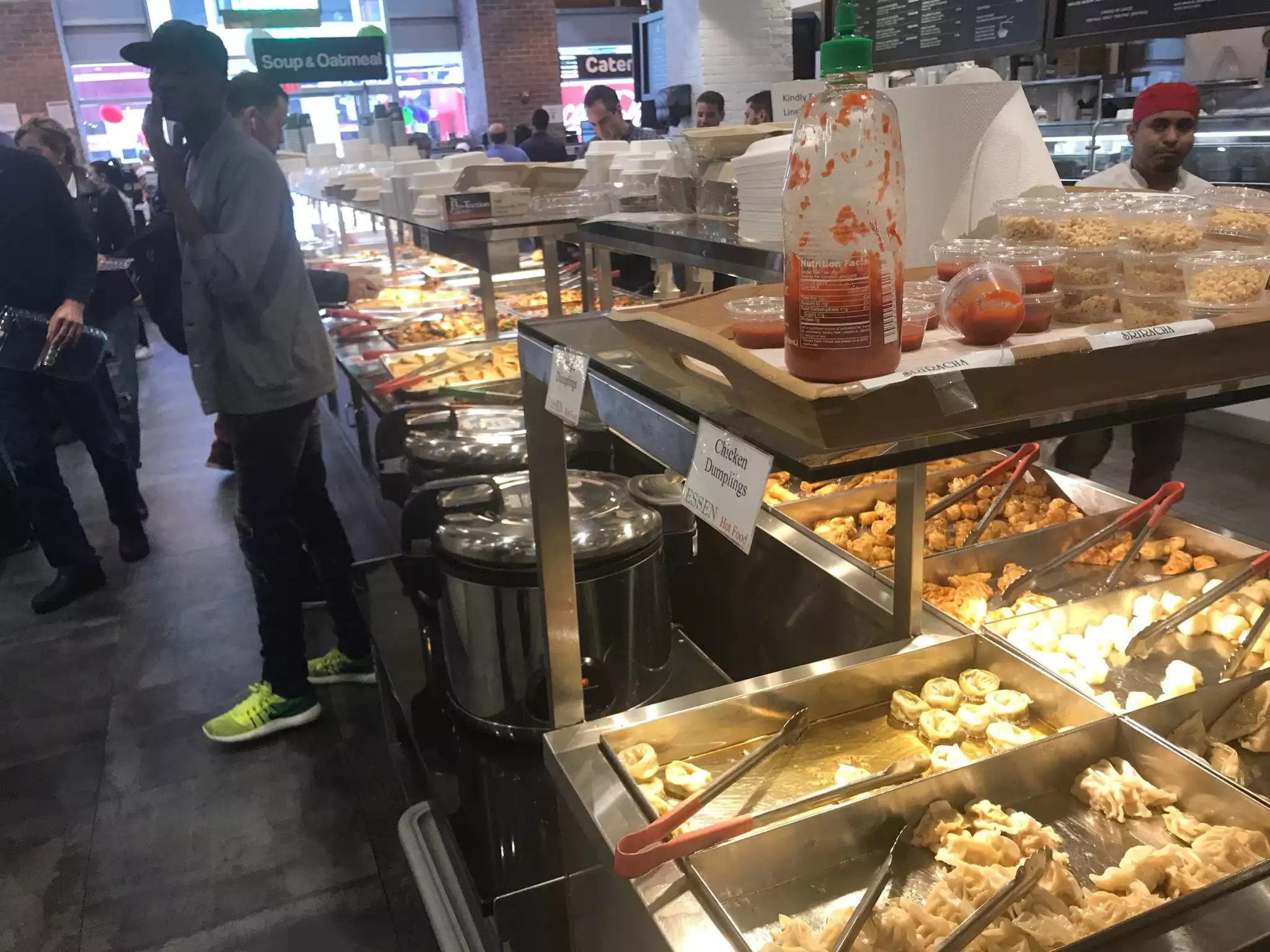 We stopped here for lunch before getting our train to Boston. There's plenty of cafeteria style seating upstairs. There are 100s of choices of salad, hot foods and desserts. You pick which size bowl you want and you can then add whatever you want. I had teriyaki chicken, sesame chicken, tempura vegetables, pasta, rice, wedges, mushrooms, salad and lots of other bits and pieces. You pay by weight. It's not the cheapest place I have been to, my salad bowl was $13 but the quality was high and we will definitely return.