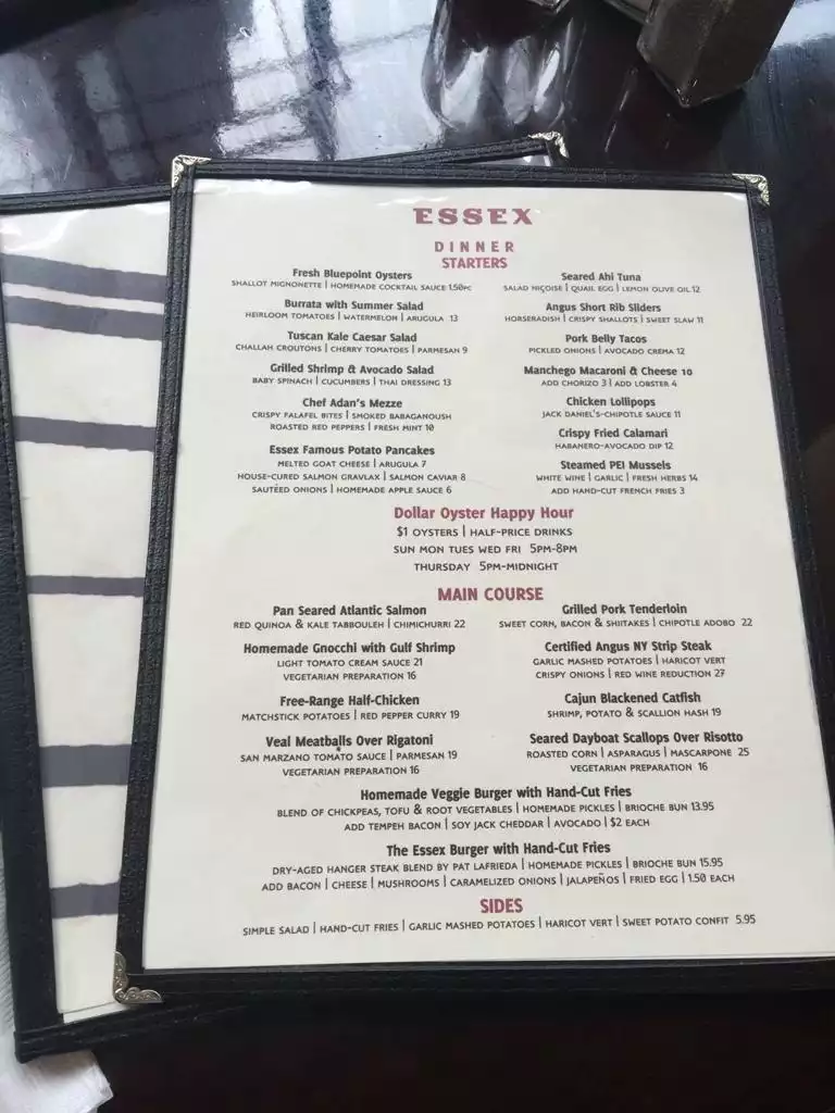 Essex was recommended by a dear friend so of course we had to go! The hostess recognized the name on the reservation and greeted us warmly, using our name - always a good sign. Service was good, happy hour drinks and oysters were well priced and delicious, entrees were excellent! Between the 3 of us we ordered salmon, gnocchi and shrimp, and a steak - plus fruit sorbet and strawberry tarts for dessert. All were really good and at reasonable prices!