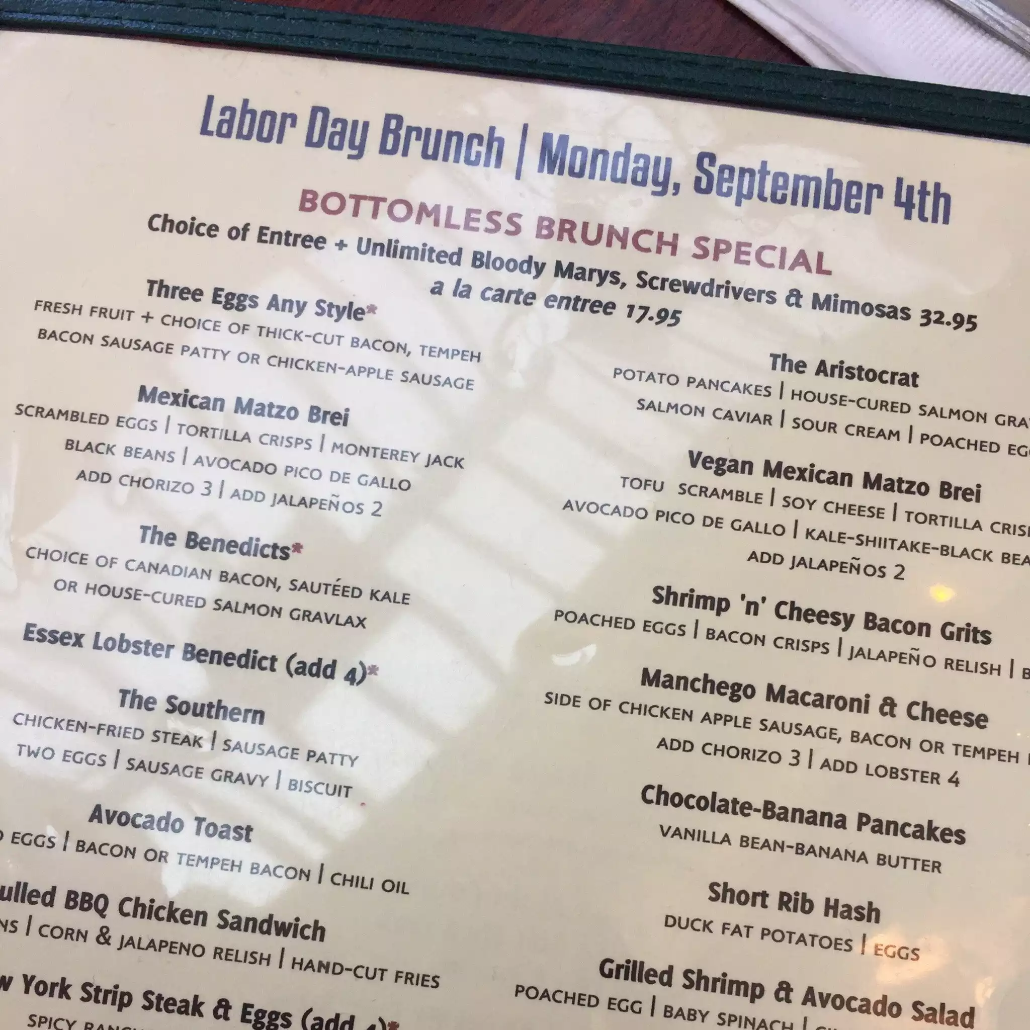 We originally went to the Essex Street Market to eat at Shopsins, but they were closed for the day. We did get to see Mr. Shopsin sleeping in his chair (watch the documentary "I Love Killing Flies"). So we ended up eating at the Essex Restaurant and the food was good. We sat on the top level. The space can be a little cramped, but manageable. We went during brunch time and ordered from the $22.95 brunch menu that included your meal and 3 Bloody Marys or 3 Screwdrivers or 3 Mimosas. The eggs were nice and fluffy. Service was good. Brunch Times: Saturday 11AM - 4:30PM Sunday 11AM - 8PM