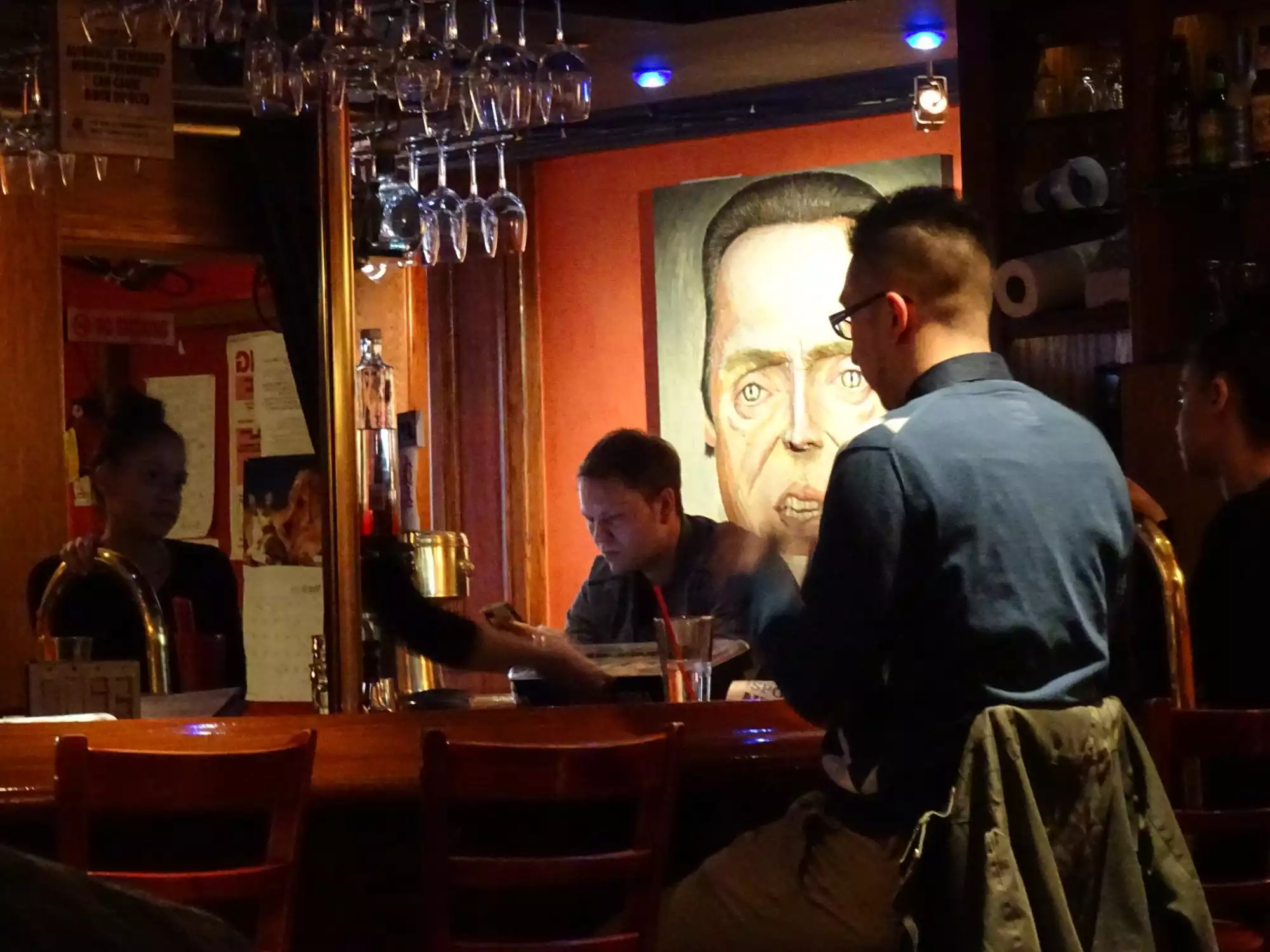 Went for a drink after dinner and ended up staying several hours. We expected a tourist trap and were pleasantly surprised to find a warm, relaxing place to enjoy some good cocktails and conversation. The drinks were done well, and when one of us spilled one unglamorously, the staff cheerfully came to clean it, and my companion up and then arrived with a new drink. We loved the music, which consisted of an array of more and less familiar Alternative bands of the 80s and 90s (think from Talking Heads to Siouxsie and the Banshees). The walls offered lots of conversation starters, as they are hung with paintings of famous people. To call them caricatures probably brings to mind Op-Ed cartoons, but these were actual paintings, seemingly very well done, and mostly very recognizable despite -- or perhaps because of -- the exaggerated features.