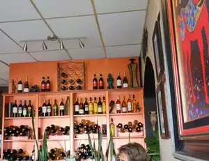 The only disadvantage of this neighborhood restaurant is it's location on a busy street and in a small strip mall. Thus, the only view is of parked cars in small spaces. But inside you step into another world of warm pita bread and delicious home cooked Mid-east food served buffet style ($13.95 for lunch) or from the menu (try the lemon chicken soup that's divine). You can savor a Greek wine, such as retsina, or sip a potent cup of Turkish coffee amidst art work of the owner that can transport you into another world. The buffet includes a number of vegan dishes, saffron chicken, beef, lamb, stews, an array of salads, and multiple desserts. In addition to the old favorites, there's usually something new added and today it was the garlic mashed potatoes. For a quick escape from the din of busy Rosecrans, enjoy lunch or dinner at Fairouz Restaurant and Gallery.