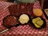 We put off eating here because we thought it was a pile of meat, and it could be if you wanted, but there were other great options to put barbecue sauce on. First the appetizers; barbecued nachos and fried catfish fingers were especially good. You also get thick fried potato chips to taste the 6 different sauces from sweet to very hot. I had a salad with pulled chicken it was so fresh and flavorful with lots of extra barbecue sauce from the bottles on the table. Pulled pork and burgers were good as was the ColeSlaw. Skip the corn bread. Nice beer selection.