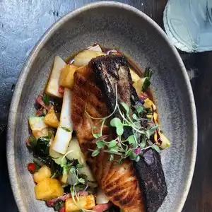 We are counting ourselves as lucky for finding this gem! Wow! I ordered the Scottish Salmon which was perfectly spiced and cooked. The pineapple, bok choy and duck bacon were the perfect complements. Others at my table ordered the snapper, Mediterranean salad with salmon, a plantain dish with pulled pork and macaroni and cheese, and all four of us were in agreement that everything was excellent! The restaurant was beautifully decorated and modern and we were happy with the service. I highly recommend!