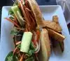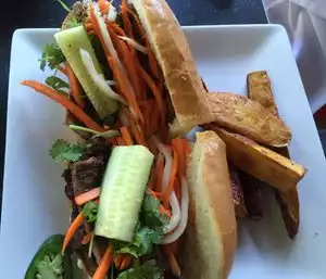 This restaurant is conveniently located. We arrived for happy hour and sat outside to enjoy the weather. The hostess and waiter were very friendly and explained the dishes and shared their recommendations. We tried the bap nurong (grilled corn), bo cuon (beef rolls) and banh mi pork sandwich with sweet potato fries. The food was very tasty. The pork in the sandwich was full of flavor and the fries were super tasty. During our visit, it got super busy and our waiter was doing his best to keep up with all of the tables.