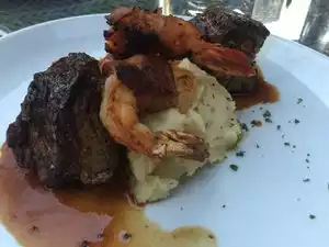 Great service and food. Highly recommend the surf & turf. Friendly staff. We had peach salad and shrimp cocktail for appetizers. Both were great also.