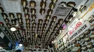 The South is famous for quirky local restaurants, so perhaps we shouldn’t be overly surprised that the owners of Flying Fish apparently don’t like bare walls. The Dallas, Texas, local (mostly) chain has fed its obsession by carpeting the walls with fake fish and photos. The Billy Bass Adoption Center, as the sign proclaims it, features bass mounted on trophy-esque planks attached to walls and ceiling. By the hundreds. I tried to count. Forget it. All bass were allegedly snagged by patrons, indicated by names and dates. Oddly, every one of these trophy fish look identical. Well, not so oddly, when you recognize “Billy Bass.” Remember? Those singing plastic fish that were so popular a few years back? These bass weren’t singing. Maybe that’s saved for special occasions. Framed photographs squeeze around the Billys, also in the multiple hundreds, surely, a reminder of those old restaurants from the 40s that liked to show off their famous past patrons. No one in these photos looked too famous. Wait! Is that George Bush at the table by the corner? His office is around here, so I snapped a picture. But naw. No president would risk strolling around Dallas. Consider the history. It’s probably word clutter to tell you that the Flying Fish features, well, fish. Catfish, of course, but also a bit of trout, salmon, grouper and such. On the crustacean side we have shrimp, crawfish, lobster. Gumbo. Grits and hush puppies. Po’ Boys. Fried okra. Raw oysters on the half shell! (A bit on the small side.) Beer on tap. Breakfast starts at 7. You order at the counter, pick up yourself, eat among Billys, nothing fancy. What more could you want, really? Well, one thing is not on the menu. Bass.
