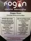 I've been to Fogon Cocina before but not for their happy hour. I won't make that mistake again. I was very impressed with their offerings as well as the generous Ultimate Margarita. I had the Quesadilla Frito which was delicious and crispy, not greasy at all. I also had the chicken tacos which were generous and equally delicious and very nicely seasoned with just the right amount of heat. My friend had the Enchiladas Verde off the regular menu. More traditional in presentation with mexican rice and refried beans. He enjoyed them so much I didn't get a chance to snag a bite. Efficient, friendly service we sat in the bar area and watched some basketball while enjoying our time there.