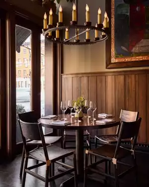 Cozy, warm Sophisticated interior and Interesting food for a lunch. We had the polenta and squash with granola Padang grated cheese and arugula and a Cobb salad . The sparkling water was complimentary. Lovely restaurant to dine in on a cold afternoon with the warm lighting and exposed kitchen. The restaurant does add 20% gratuity which is a good thing for all