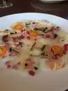 When I was reading the menu that offered oysters on a half shell and shrimp carpacio I never expected the different flavors my mouth was about to recieve. I can't even begin to explain it to you, but I will try. The shrimp carpacio had a delicate smokey flavor mixed with sweet etc. and was delicious and beautiful to look at. The oysters had a tiny piece of riped green strawberry that was so unexpected to be on an oyster but I loved the combination.My fish dish was tasty and I enjoyed it. My husband thought his pork and spetzel dish was to salty but he thinks that I over salt so it just might be him. We did not have dessert.