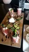 We tried the cheese and charcuterie plates. Excellent selection and good quantity! But the pizza was amazing. Fire roasted almost like flat bread. Fresh toppings good sauce. Great drinks fantastic deserts