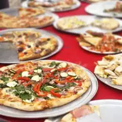 We had a work lunch here today and i really enjoyed it. I love the outdoor seating with the lights hanging. The atmosphere is great. We had the sampler pizza and 2 others. Also the Calamari, mozzarella sticks and hot wings! Everything was great!