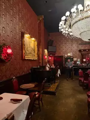 A step back in time---we ate in the main room where the bar and piano is. A massive chandelier, heavy flock wall-paper with portraits of naked women set a Bordello theme. The wait staff are in fishnet stockings and music-hall outfits. The pianist's selection created a very relaxed and enjoyable atmosphere in which to dine. Very attentive staff. The scallops, steak, and sides of spinach, asparagus and twice-baked potato were good. We did have to request sour cream for the potato and the house salad was just awful to look at and tasteless. Nevertheless it was a very enjoyable experience.