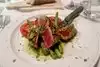 Dressed for travel I was asked if I wanted bar? No so a booth near hall entrance. Expensive but tuna dinner was different taste for me. Got sauce on side, didn't like it at all. Waitress not Hilton quality, saw me put on jacket and came over to finally ask if anything else or dessert menu? Bus boy was on the spot to take dirty plate.