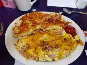 Shared a German sausage and cheese omelette with a friend, one serving is plenty of food for both, just the right amount of German sausage, hash browns we're tasty, enjoyed the pleasant atmosphere of the waitresses interacting with the other patrons. Small, clean, quaint restaurant. I really liked that they kept the coffee cup full and that they open in time for night shift workers to get breakfast.