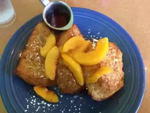 So glad we followed the reviews to this local eatery. Everything we ordered was yummy. Herbed omelette was outstanding, pumpkin pancakes with cinnamon butter even better, French toast with peaches, the highlight of the meal. Don’t miss this place, but get there at opening, or you’ll be waiting for a table.