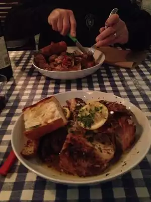 We were looking for the pizza next door (Antico's) but they were closed. Good omen for us, as we entered Gio's instead. Non-descript and laid back atmosphere, you see all kinds of dress here. Jeans to nicely decked folks. Family style seating where you can meet some fun folks or eat by yourself. Great baked chicken! No, strike that..... The best baked chicken ever eaten, as it had an interesting, tasty lemon infusion that absolutely reminded us of Italian cooking. Basil, lemon.......basically a broth, that after the chicken was gone, we picked up the bowl to drink! You have a choice: Arancia (orange) with rosemary or Limone with basil. Both great, but the lemon is a MUST! Enjoy with a bottle of house Montepulciano D'Abruzzo vino!!