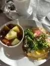 I had fresh fruit and a waffle my husband had the French toast. The fruit was a good mix of berries, melon, grapes and pineappel and there was plenty. The French toast came with a good amount of mixed barries. The waffel is fine - comes with butter and varm sirup. It all tasted good and the service was fine.