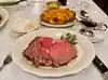 I had the seafood stuffed mushroom caps, dinner salad, baked potato and 18oz prime rib. I originally thought I would be boxing half of it up to eat later but it was so delicious that I did it in one sitting. No condiments needed for the steak, it was perfect as served. Can be considered a bit pricey at 130.00 but worth every cent.