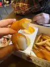 Chips had a funny taste, were hard and some burnt. They were also thin. Fish was ok. Being an Englishman in New York it was nothing like proper fish and chips. 1 member of staff was nice but another had an attitude. Sorry Gordon really below par and surprised this has your name against it. The chicken place along the road in Times Square is superior.