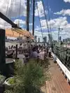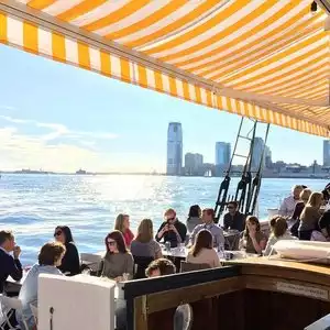 Went for lunch here on Saturday around 1 pm with my brother Gene and my dog Fiona. We got a table right away, and ordered a bottle of Rose. The views of the Statute of Liberty and New Jersey skyline were quite stunning. Also, enjoyed viewing a sailboat race happening. The wait staff were wonderful, and we ordered oysters, lobster rolls and an order of truffle infused French fries. Most attractive group of people, got more crowded as day wore on. Everything we ordered was delicious, topping our lunch off with a shared chocolate mousse. Truly a sublime time was had by all (including Fiona who ate many fries) So much fun to be aboard a sailboat on a beautiful day without leaving town