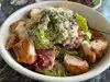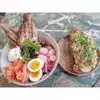 Excellent salads with herbs, snap peas, spaghetti squash, salmon curry bowl with black rice, swim club sandwich, and smoothie bowl. Focus on fresh notes like mint, Thai basil, and kumquats. The vegetables came with delicious and colorful sauces underneath with beets and hazelnuts, for example . The salmon was cooked to perfection (one of the best Iâve ever had).
