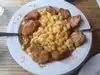 Ordered the wiener schnitzel and the meat was a nice large size, but it had no taste, was bone dry, and was encased in a thick bland crust. Alongside was a tiny portion of potato salad featuring two barely cooked through lumps of potato. Also served were tasty slices of baby cucumber.