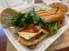The sandwich was well proportioned and the bread used was great. The sandwich already came topped with slaw but as my accompanying side, I received more slaw. I asked to swap out the side for cucumber salad and was told, 'No, that's not available.' Rather, I had to purchase an additional cucumber salad side. Will return for take out only.